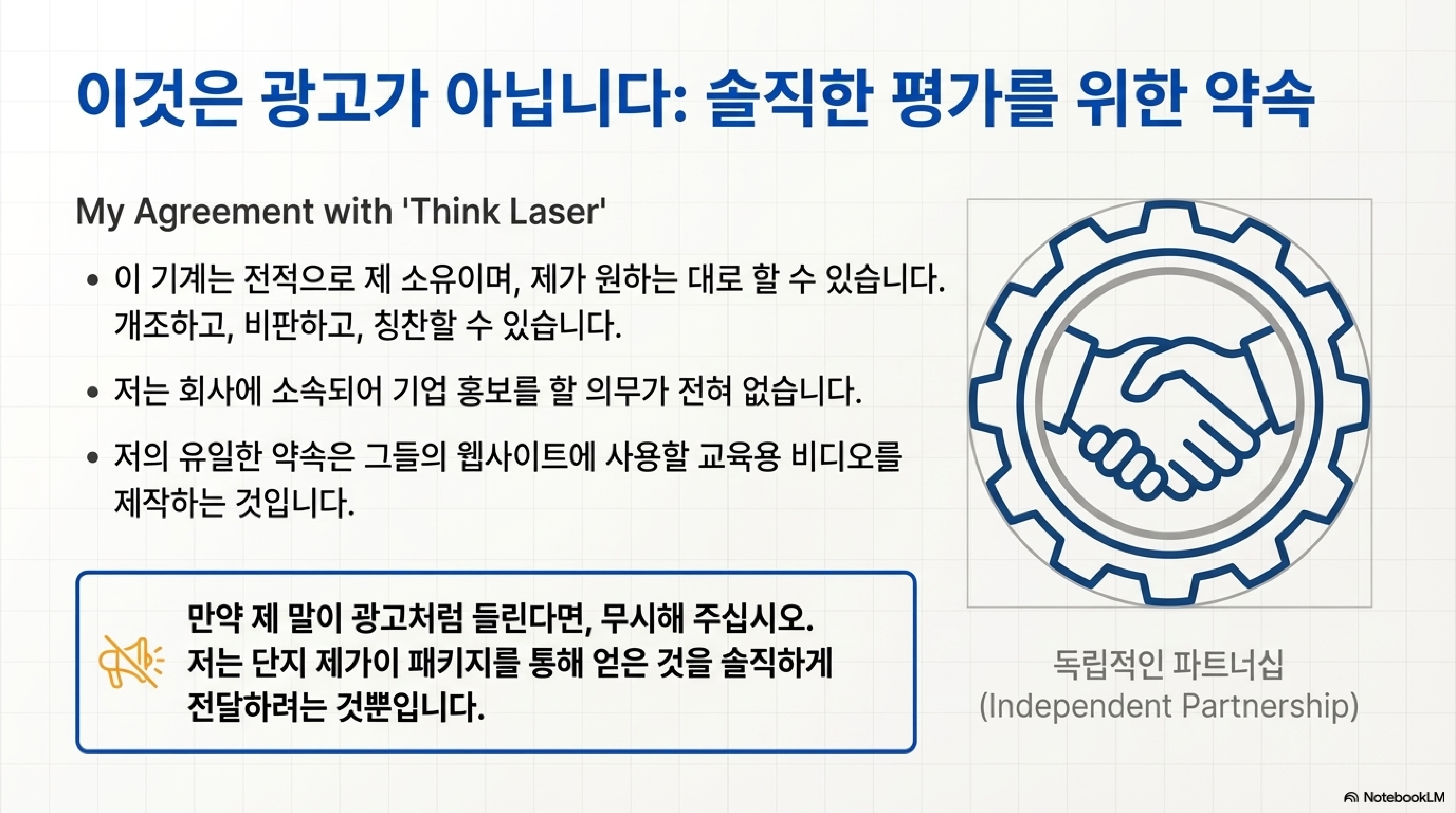 "이 기계는 제 소유이며 제가 원하는 대로 할 수 있습니다. 개조할 수도, 비판할 수도, 칭찬할 수도 있죠. 저는 이 기계로 Think Laser를 위해 기업과 관련된 어떤 일을 해야 할 의무가 전혀 없습니다."