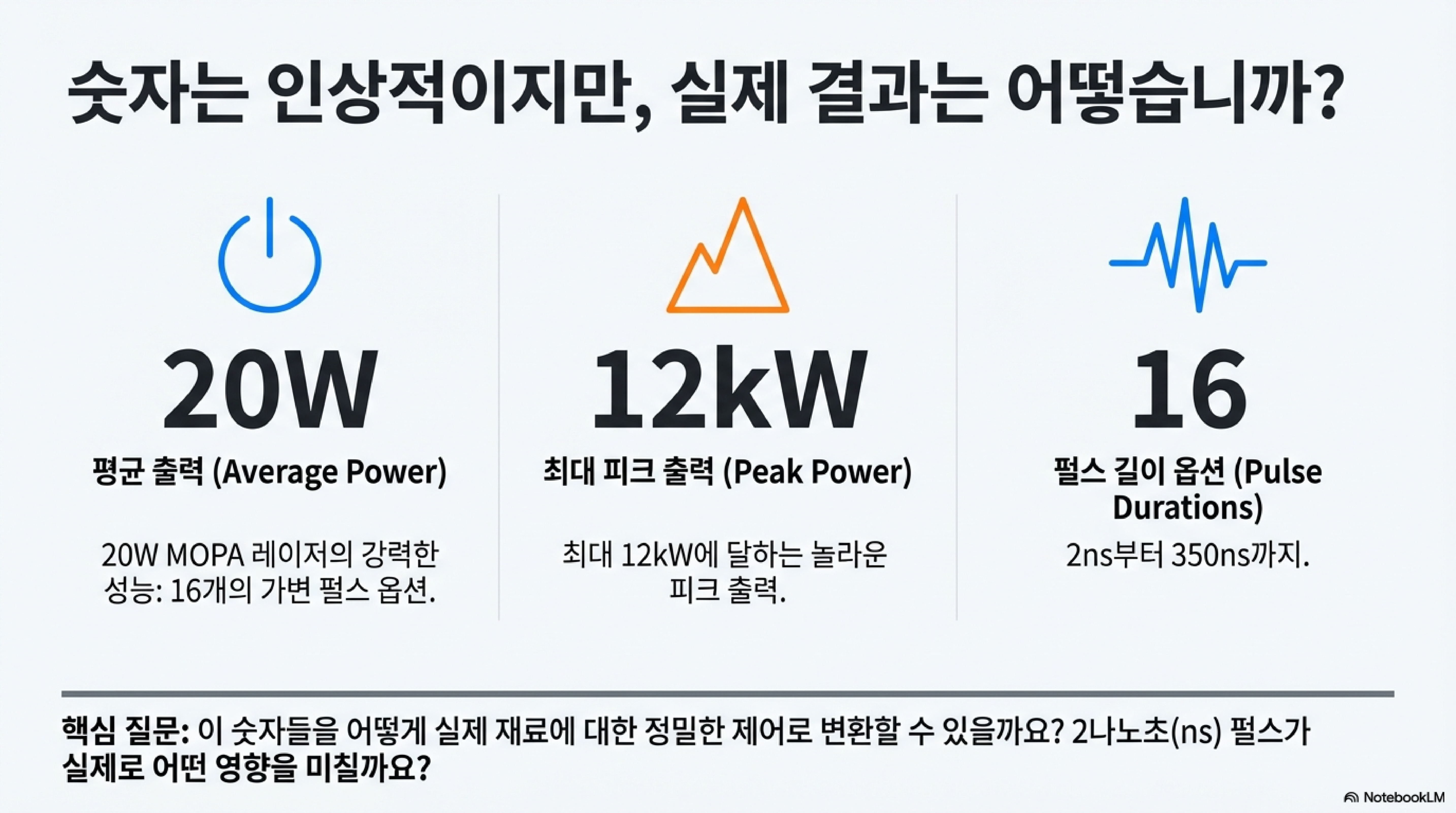 이 레이저의 사양을 보면 입이 떡 벌어집니다. 2나노초(10억 분의 2초)라는 극히 짧은 순간에 최대 12킬로와트(kW)에 달하는 엄청난 최고 출력을 낼 수 있다고 합니다. 하지만 이 숫자가 실제로 재료에 어떤 영향을 미치는지 직관적으로 이해하기는 어렵습니다.