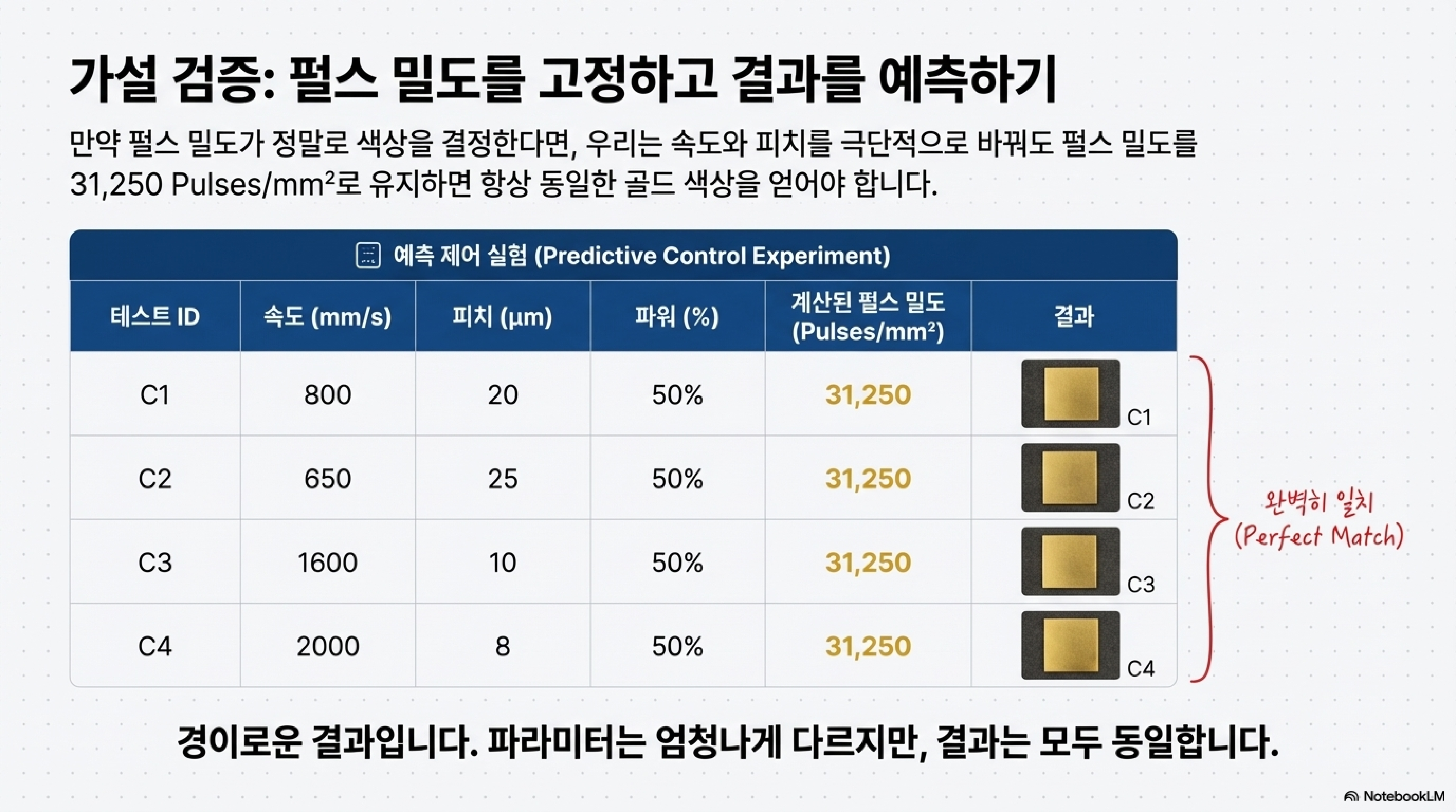 이것이 단순한 우연이 아님을 증명하기 위해, 저희는 '31,250 펄스' 공식을 사용해 새로운 설정을 예측했습니다. 예를 들어, 20마이크론이라는 넓은 피치에서는 800mm/s의 속도가 필요할 것이라고 계산했습니다. 테스트 결과, 완벽하게 동일한 골드 컬러가 만들어졌고, 이로써 펄스 밀도가 최종 색상을 결정하는 진정한 마스터 변수임이 증명되었습니다. 저희는 "경이로울 정도로 다른 파라미터 설정에도 불구하고 모두가 동일한 결과에 도달하는" 현상을 재현하며 이 원리를 확신하게 되었습니다.