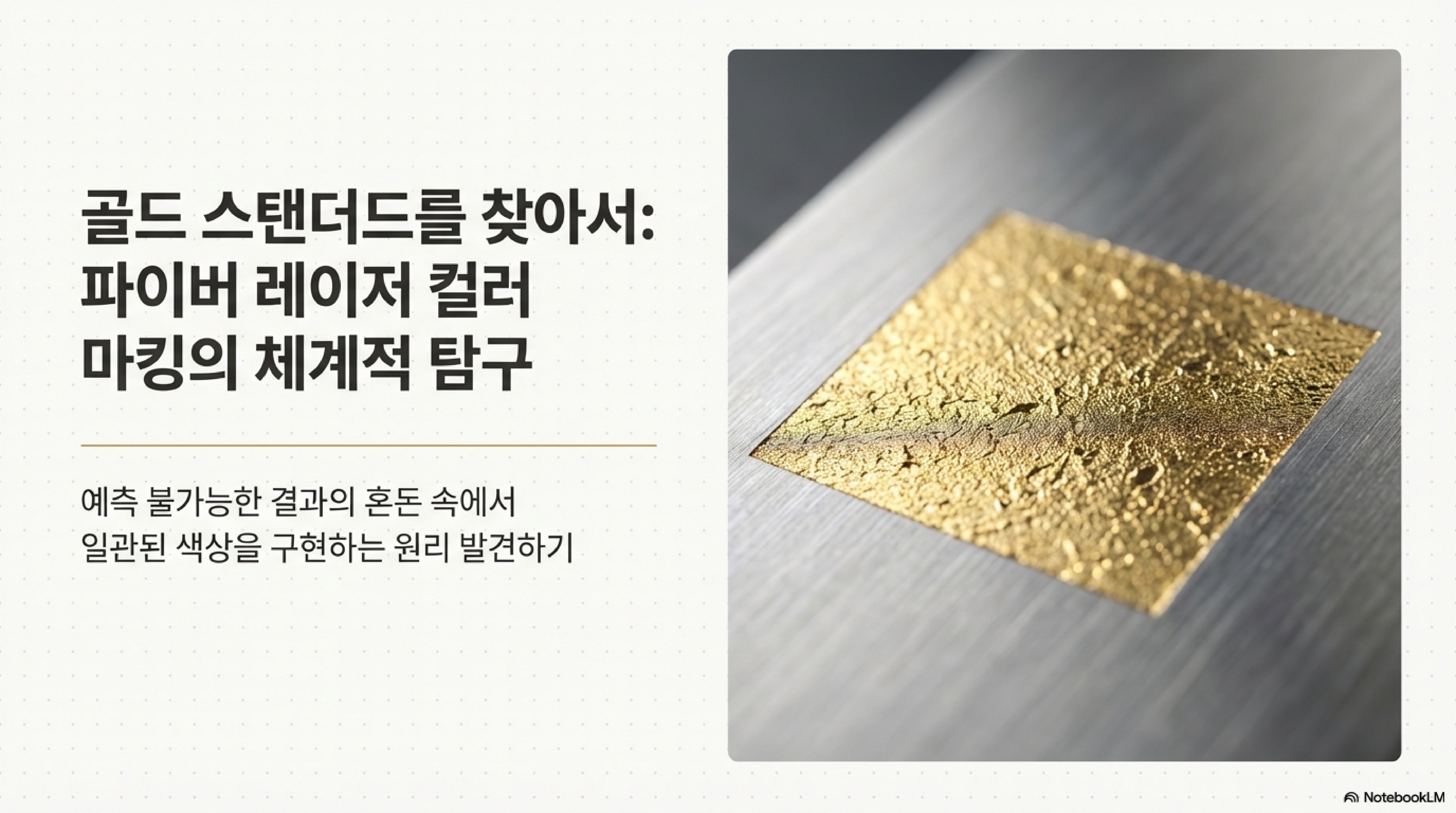 하지만 만약 단 하나의 색, 바로 '골드' 컬러를 완벽하게 구현하는 데에만 집중한다면 어떨까요? 저희는 이 한 가지 색상을 깊이 파고드는 여정을 통해, 레이저로 색을 만드는 원리와 우리가 색을 인식하는 방식에 대한 몇 가지 놀라운 사실들을 발견했습니다. 이 글에서는 그 과정에서 얻은 예상치 못한 통찰 4가지를 공유하고자 합니다.