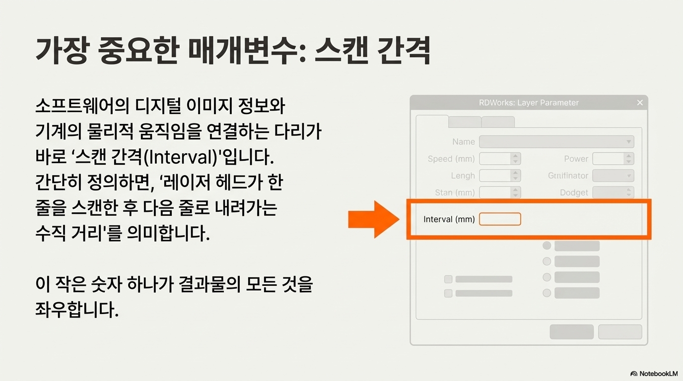 레이저 각인 소프트웨어(RDWorks 등)를 열면 수많은 설정값이 보입니다. 대부분의 사용자는 '파워'나 '속도'에만 집중하지만, 사진 각인의 성패를 좌우하는 진짜 주인공은 다른 곳에 있습니다. 바로 '스캔 간격(Interval)'입니다.