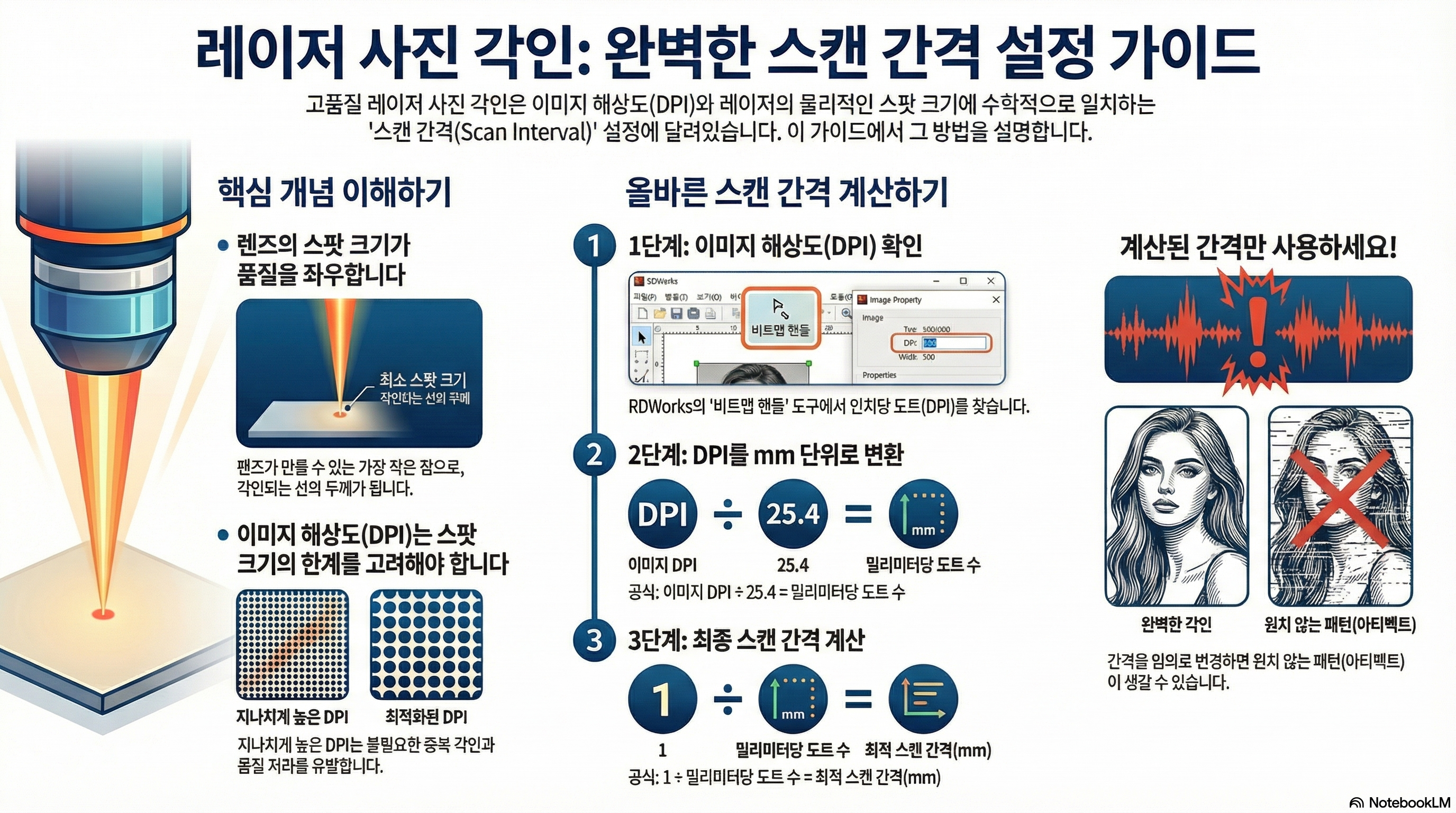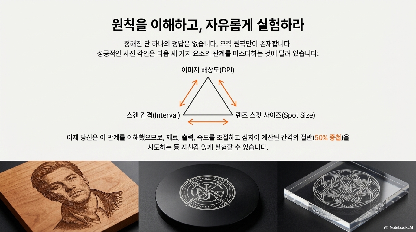 성공적인 레이저 사진 각인의 핵심은 더 이상 파워나 속도를 무작정 바꾸는 데 있지 않습니다. 진짜 비밀은 이미지 해상도(DPI), 렌즈의 스팟 사이즈, 그리고 스캔 간격이라는 세 가지 요소의 관계를 이해하고, 이를 수학적으로 정확히 일치시키는 데 있습니다.