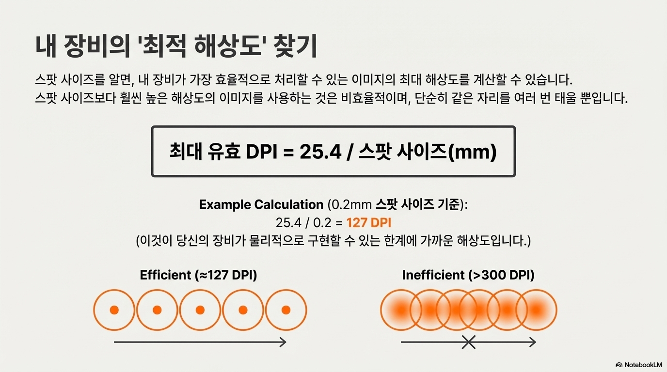 이 0.2mm라는 물리적 한계는 특정 해상도 값으로 변환할 수 있습니다. 1인치는 25.4mm이므로, 간단한 계산(25.4mm ÷ 0.2mm = 127)을 통해 이 렌즈가 물리적으로 표현할 수 있는 최대 해상도는 약 127 DPI(Dots Per Inch)임을 알 수 있습니다.