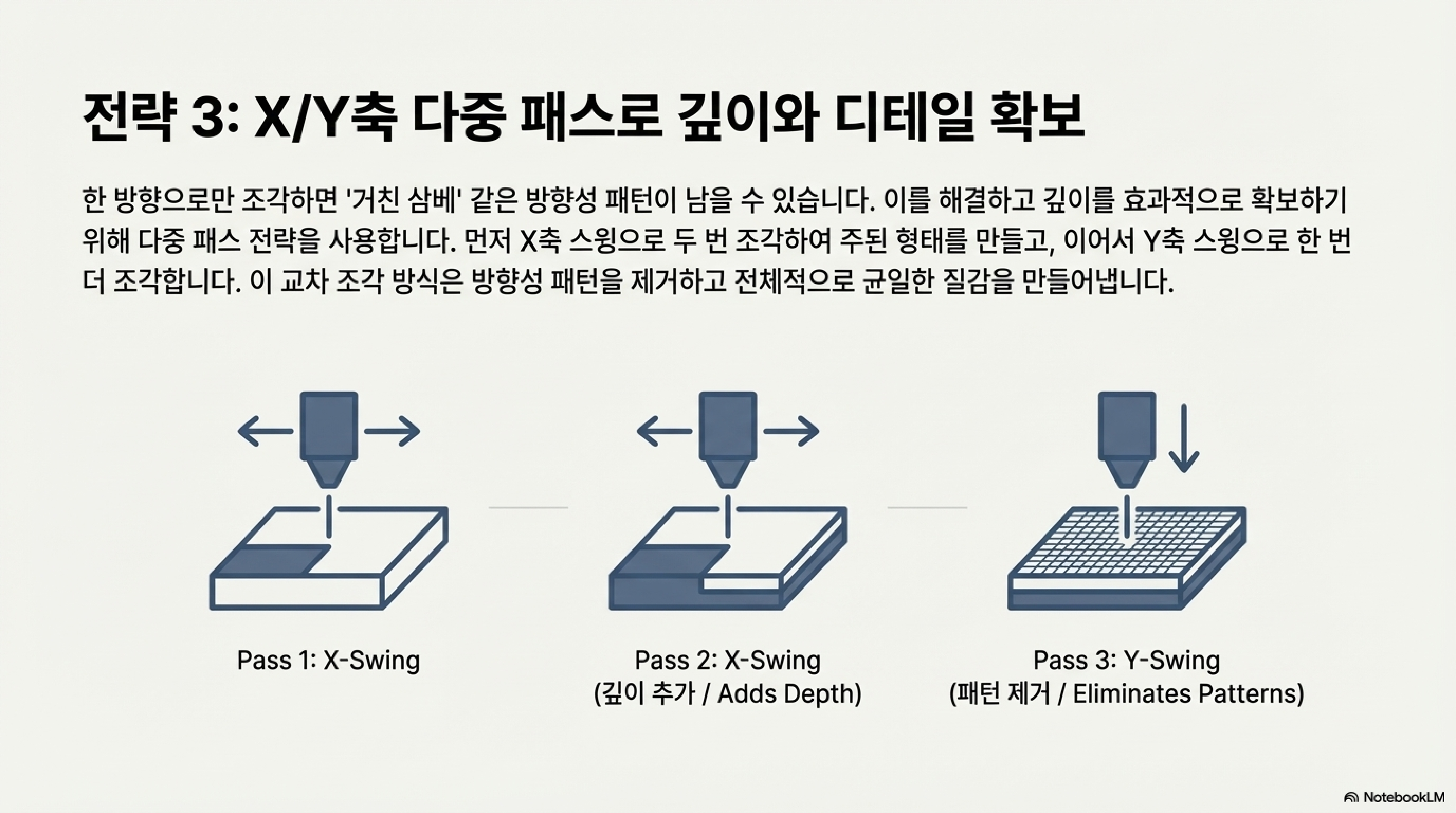 주요 조각 패스가 완료된 후, 마지막으로 고속(예: 200mm/s) 패스를 추가하는 기술입니다. 이 패스의 목적은 더 깊이 파내는 것이 아니라, 표면을 정리하고 잔여물을 제거하는 '폴리싱 컷(polishing cut)' 역할을 하는 것입니다.