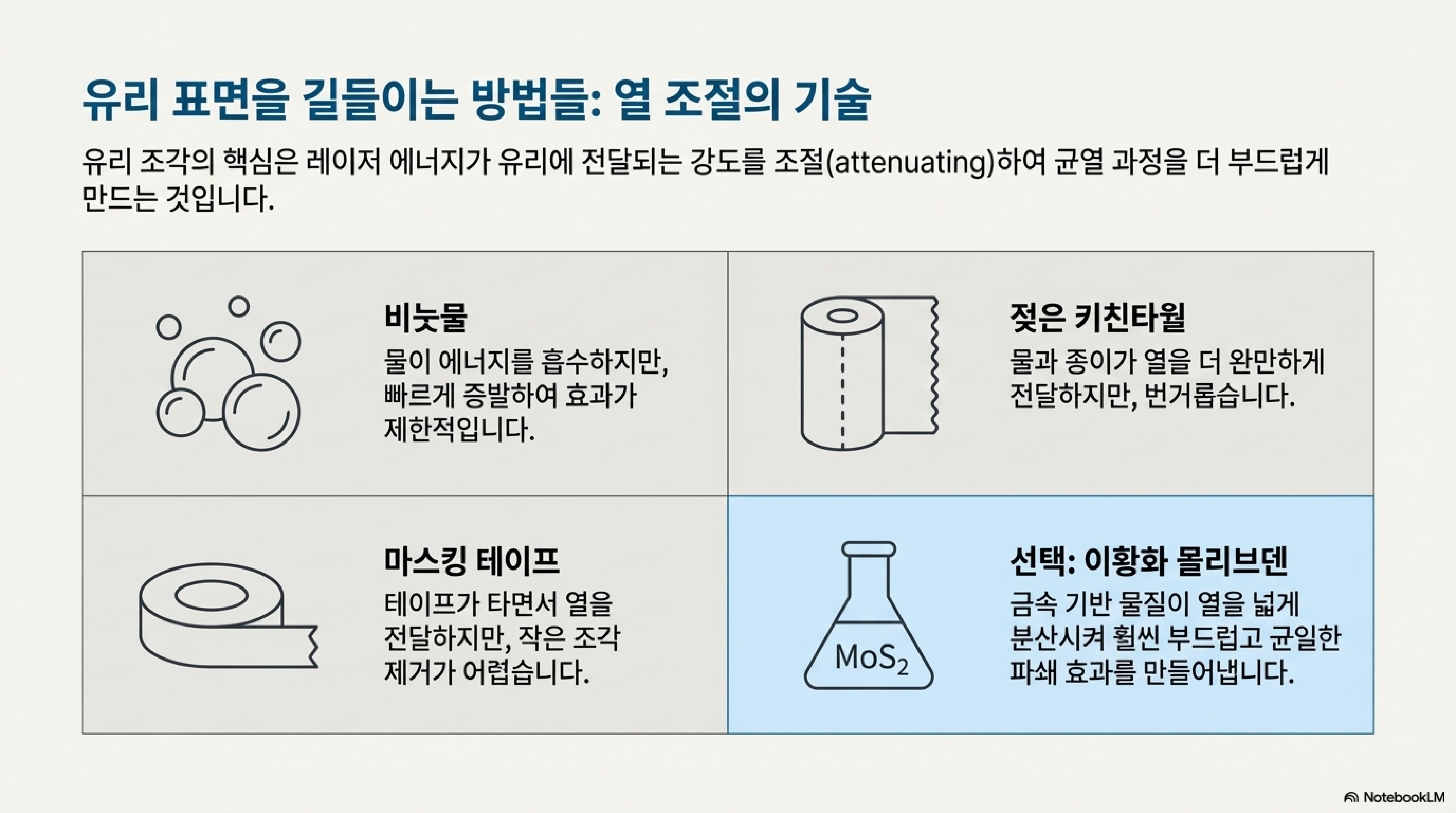 물론 비눗물, 젖은 종이 타월, 마스킹 테이프 같은 흔한 방법들도 있습니다. 이들 모두 레이저의 열이 유리에 직접 닿기 전에 '열을 약화시키는' 동일한 원리로 작동합니다. 하지만 개인적으로는 덜 안정적인 이 방법들보다 이황화 몰리브덴을 사용하는 것을 추천합니다. 그 효과의 차이는 분명합니다.