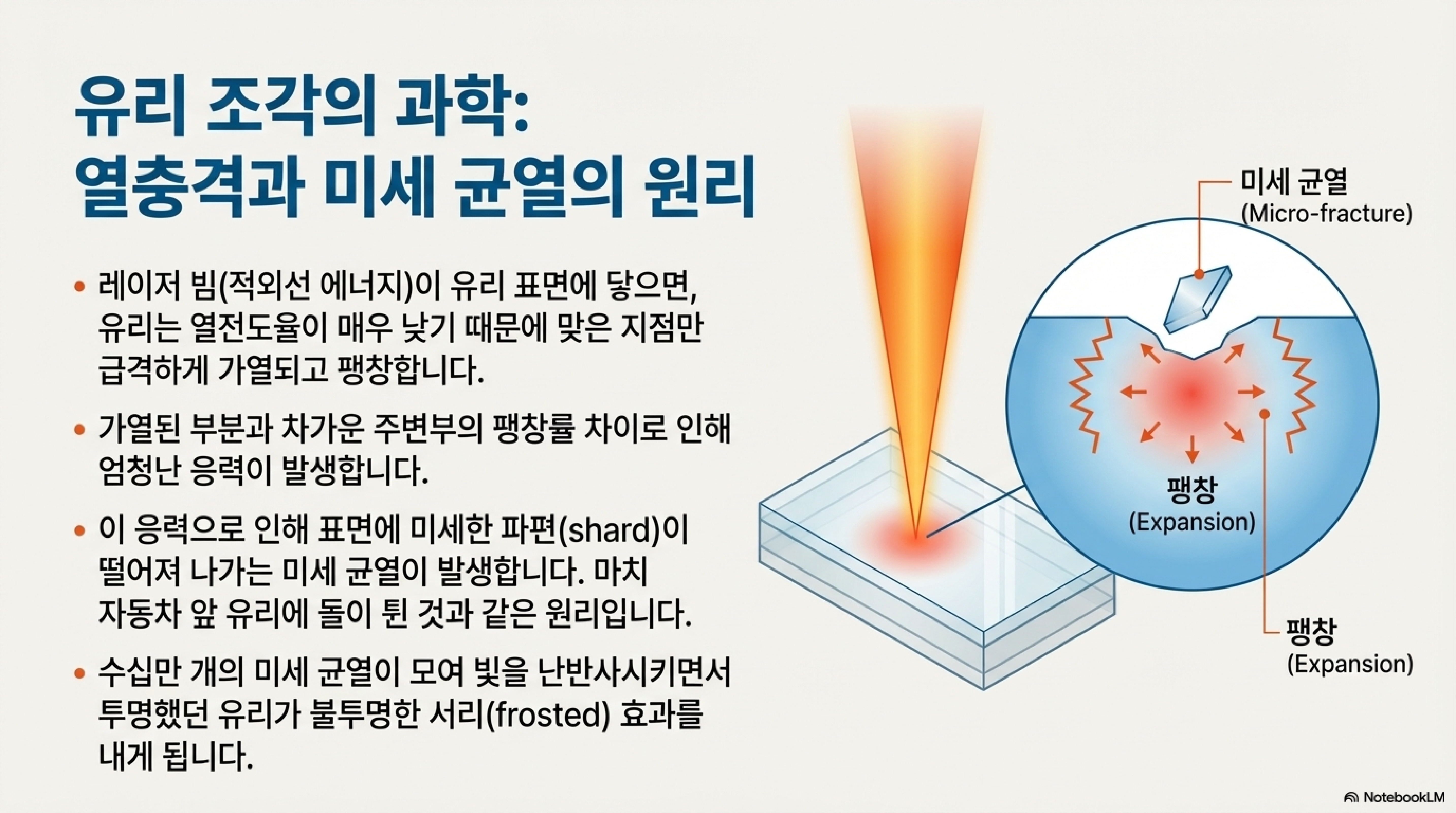 이 급격한 팽창은 미세한 균열을 만들고, "아주 작은 유리 파편을 튀어나오게" 합니다. 이는 마치 자동차 앞 유리에 돌이 튀어 생기는 '돌빵'과 매우 유사한 과정입니다. 우리가 보는 유리 각인의 아름다운 반투명 효과는, 사실 이렇게 생성된 수천 개의 미세한 파편들이 빛을 산란시켜 만들어내는 결과물일 뿐입니다.