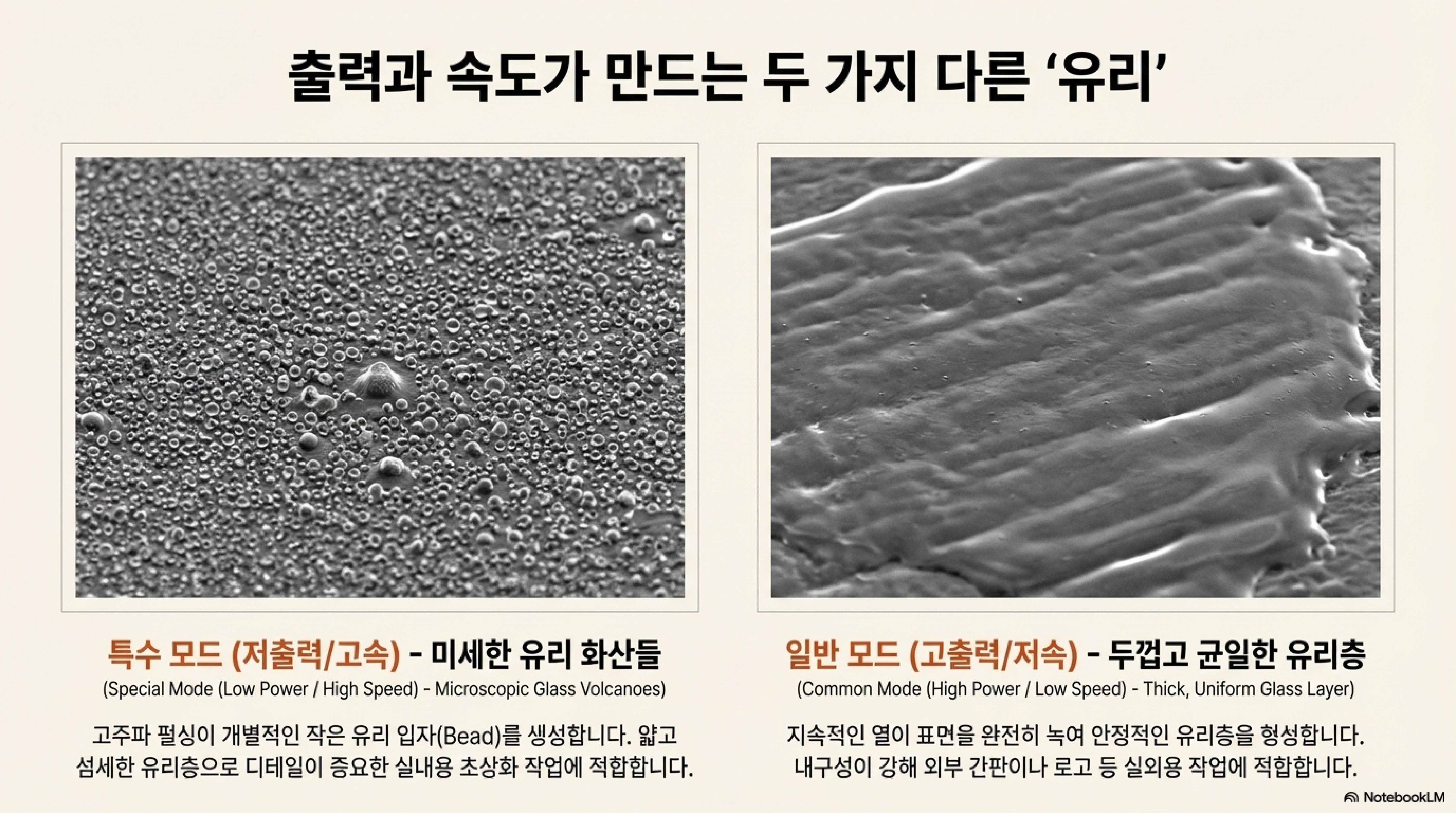 흥미로운 점은 레이저의 출력에 따라 생성되는 유리의 성격이 달라진다는 것입니다. 낮은 출력으로 작업하면 표면에 얇고 섬세한 유리층이 생겨 실내 초상화 작업에는 적합하지만, '모래 위에 집을 짓는 것'처럼 내구성이 약합니다. 반면, 높은 출력으로 깊고 두꺼운 유리층을 만들면 야외에 설치할 집 이름패처럼 내구성이 강한 결과물을 얻을 수 있습니다.