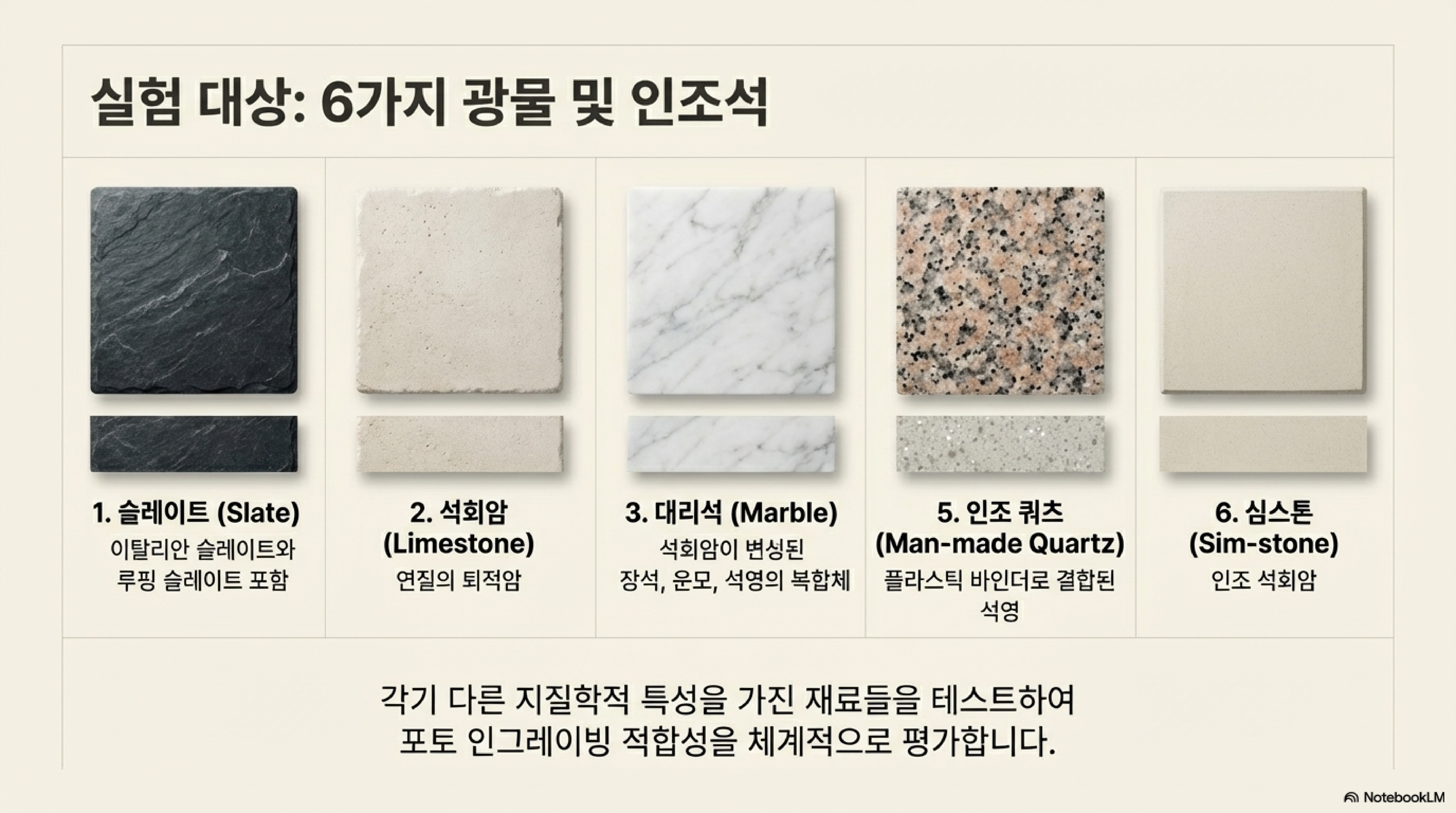 실험 결과, 사진 각인에 가장 유망한 재료는 의외의 것이었습니다. 단단한 화강암이나 고급스러운 대리석이 아니라, '굳어진 진흙'에 불과한 저급 재료로 여겨지는 평범한 슬레이트(점판암)가 최고의 가능성을 보여주었습니다. 슬레이트는 레이저를 쏘았을 때 다른 어떤 재료보다도 선명하고 뛰어난 대비(contrast)를 만들어냈습니다. 슬레이트의 성공 비결은 바로 균일하고 미세한 입자로 구성된 재료의 특성 덕분이었습니다. '굳어진 진흙'이라는 본질 덕분에 레이저의 열에 전체적으로 고르게 반응할 수 있었던 것입니다.