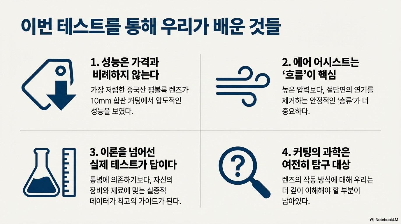 모든 이론과 가설을 뒤로하고 진행된 10mm 합판 커팅 테스트의 결과는 그야말로 충격적이었습니다. 모든 렌즈는 동일한 출력과 에어 어시스트 조건에서 테스트되었습니다.