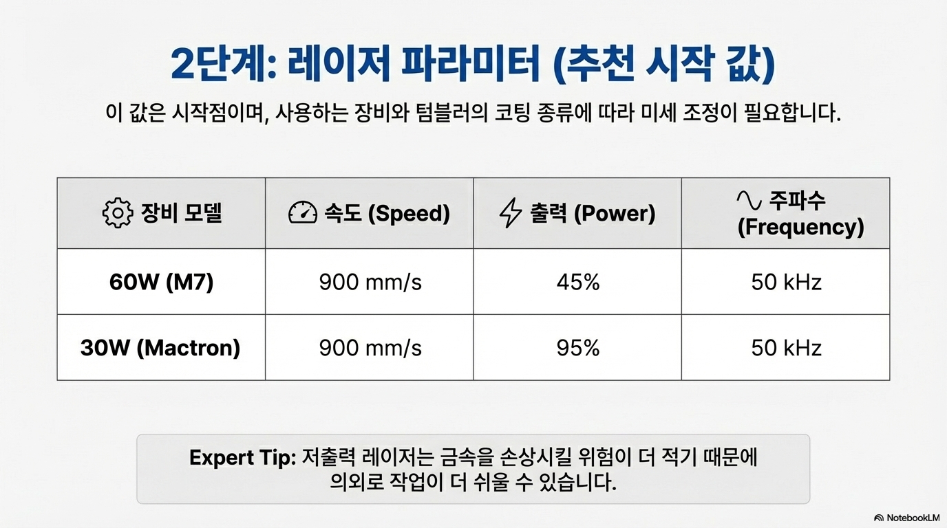 일반적인 생각과는 달리, 이 작업에서는 60W 같은 고출력 레이저보다 30W 같은 저출력 레이저가 오히려 더 쉬울 수 있습니다.
