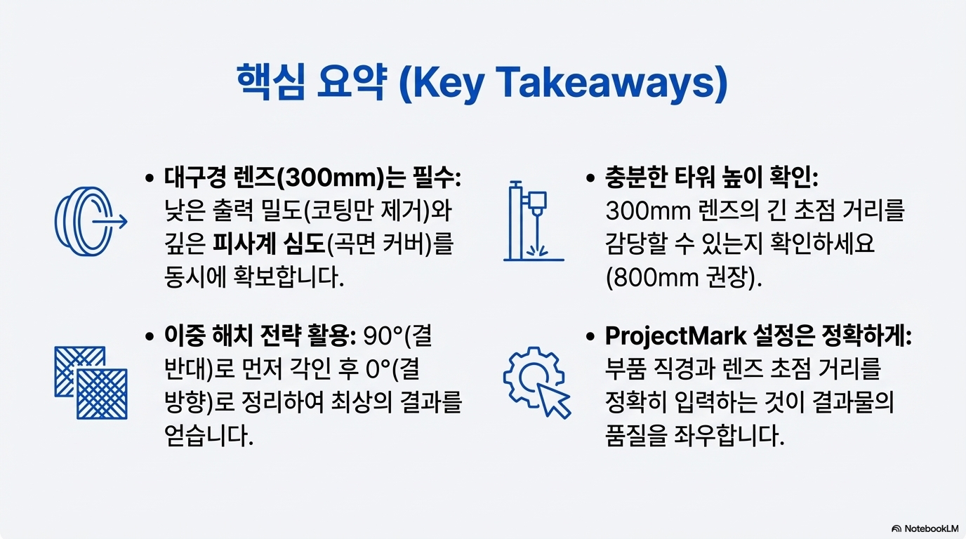 결론적으로, 큰 렌즈를 활용하여 파워 밀도와 초점 심도 같은 레이저의 물리적 특성을 이해하고 조절한다면, 회전 장비와 같은 특수 액세서리 없이도 새로운 작업의 문을 열 수 있습니다. 이전에는 불가능하거나 어렵다고 생각했던 프로젝트를 훨씬 간단하게 해결할 수 있게 되는 것이죠.