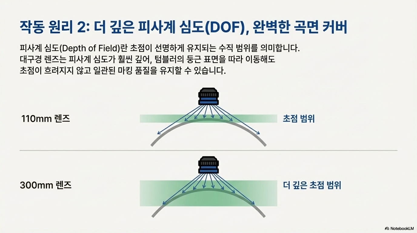 작은 렌즈는 초점 심도가 수 밀리미터에 불과할 정도로 매우 얕습니다. 이 때문에 둥근 텀블러 표면을 따라 각인하다 보면, 곡면의 높이 차이로 인해 금방 초점이 흐려져 각인이 제대로 되지 않습니다.