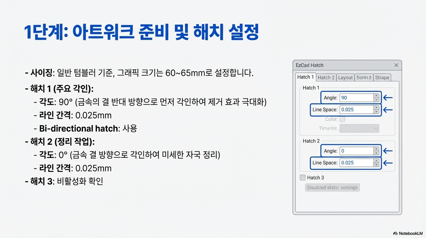 왜 이렇게 두 번에 걸쳐 각도를 다르게 설정할까요? 텀블러의 금속 표면에는 보통 미세하게 왼쪽에서 오른쪽으로 흐르는 결(grain)이 있습니다. 첫 번째 90도 해칭은 이 결에 맞서 가로지르며 코팅의 대부분을 제거합니다. 만약 이때 실수로 금속이 살짝 긁히더라도, 두 번째 0도 해칭이 금속의 결을 따라 지나가면서 미세한 흠집을 효과적으로 가려주어 훨씬 깔끔한 마감을 만들어냅니다.