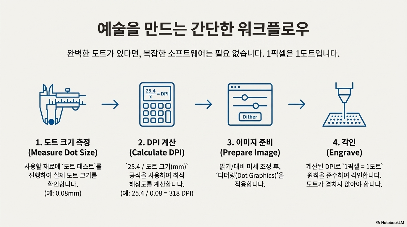 대신, 측정된 도트 크기를 기반으로 올바른 해상도(DPI)를 설정하는 이 간단하고 강력한 공식을 사용해야 합니다. 25.4 / [도트 크기(mm)] = DPI(인치당 도트 수). 이 방법은 인위적인 소프트웨어 조작 없이 원본 이미지를 충실하게 재현하도록 보장합니다. 이를 통해 사용자는 결과물을 온전히 통제할 수 있습니다.