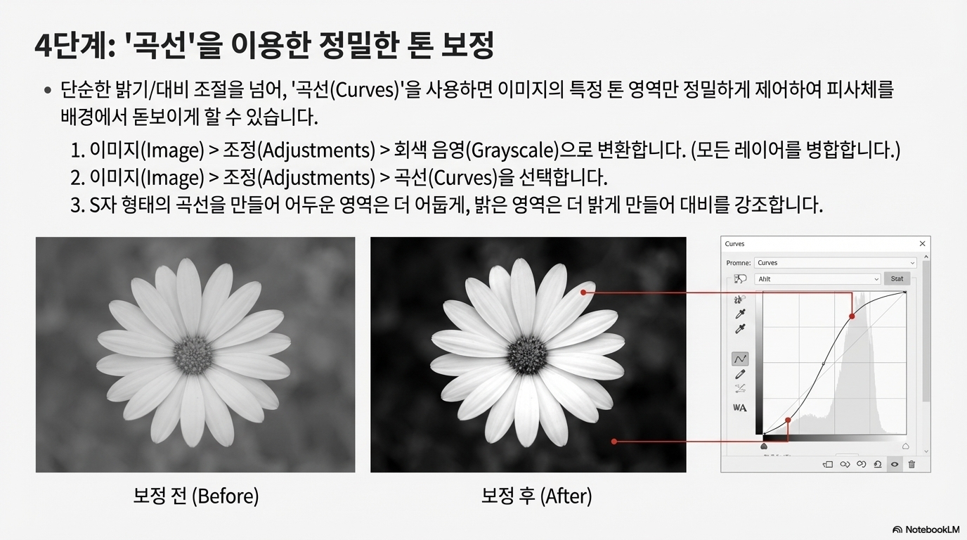 이미지의 크기와 구도를 완벽하게 맞췄다면, 이제 예술적 감각을 더할 차례입니다. 이미지를 흑백(Grayscale)으로 변환한 후, 대부분은 '밝기/대비(Brightness/Contrast)' 도구를 사용합니다. 하지만 더 깊이 있는 결과물을 원한다면 '커브(Curves)' 도구를 사용해야 합니다.
