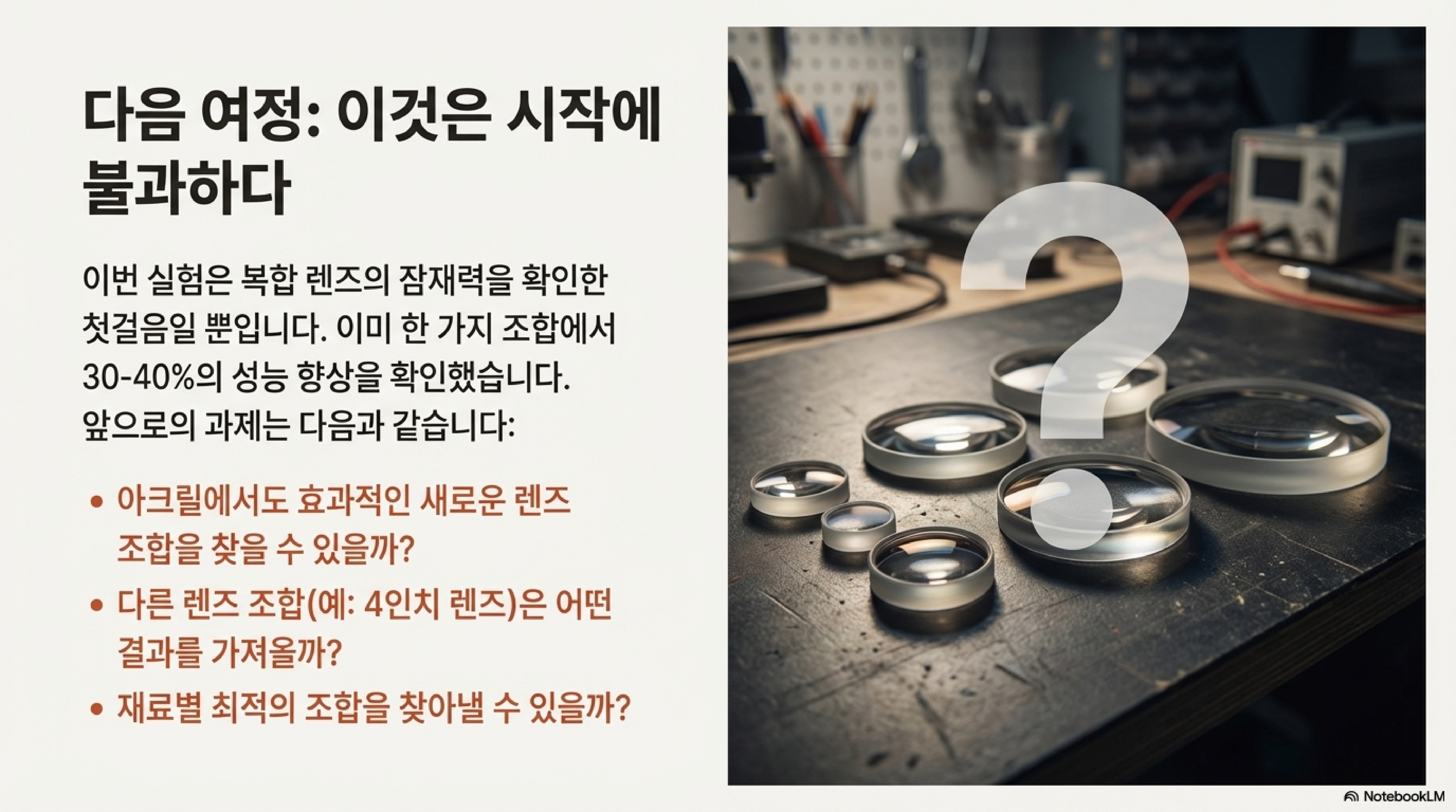 이 놀라운 결과는 저에게 새로운 질문을 던졌습니다. 아크릴을 포함한 모든 재료에서 뛰어난 성능을 보이는 더 나은 렌즈 조합을 찾을 수 있을까요? 이것이 저의 다음 도전 과제가 될 것입니다.
