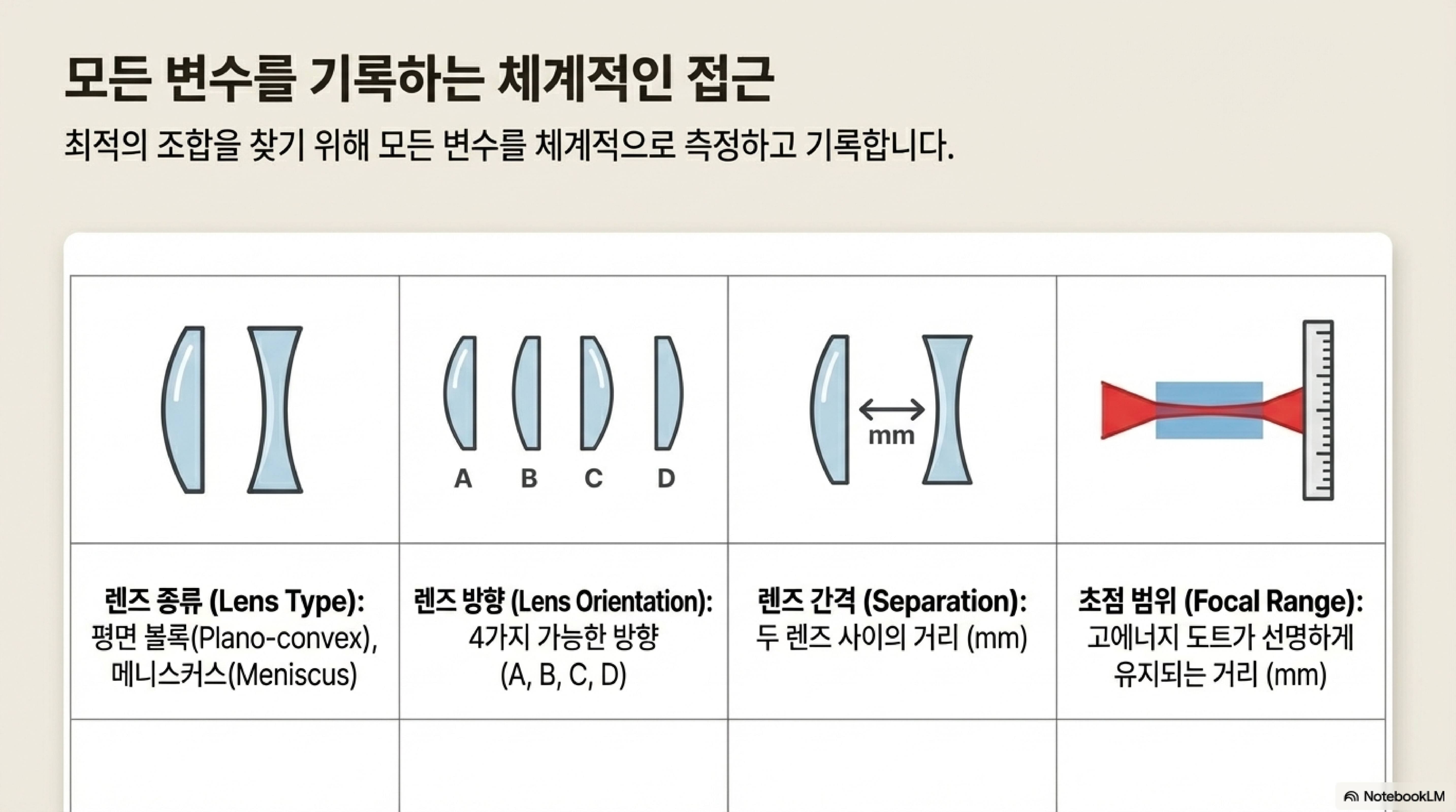 테스트를 진행하며 저는 기존의 '초점(focal point)'이라는 개념이 복합 렌즈 시스템에서는 "잘못된 명칭"이라는 것을 깨달았습니다. 단 하나의 완벽한 지점이 존재하는 것이 아니었습니다. 대신, 렌즈는 "매우 가느다란 고에너지 빛의 빔"을 유지하는 긴 '초점 범위(focal range)'를 만들어냈습니다. 어떤 조합은 이 범위가 무려 70mm에 달하기도 했습니다. 이때 저는 중요한 사실을 깨달았습니다. 초점 범위가 이렇게 길면 이론상의 '중간 지점'을 찾는 것은 거의 불가능하고 무의미하다는 것을요. 실제 작업에서는 빔이 날카로운 초점으로 들어오기 시작하는 지점을 찾고, 거기서부터 70mm 전체 구간을 활용하는 것이 훨씬 실용적인 방법이었습니다. 이 발견은 단순히 과학적 호기심을 넘어, 기계의 초점을 맞추는 방식 자체를 바꾸는 실용적인 기술이 되었습니다.