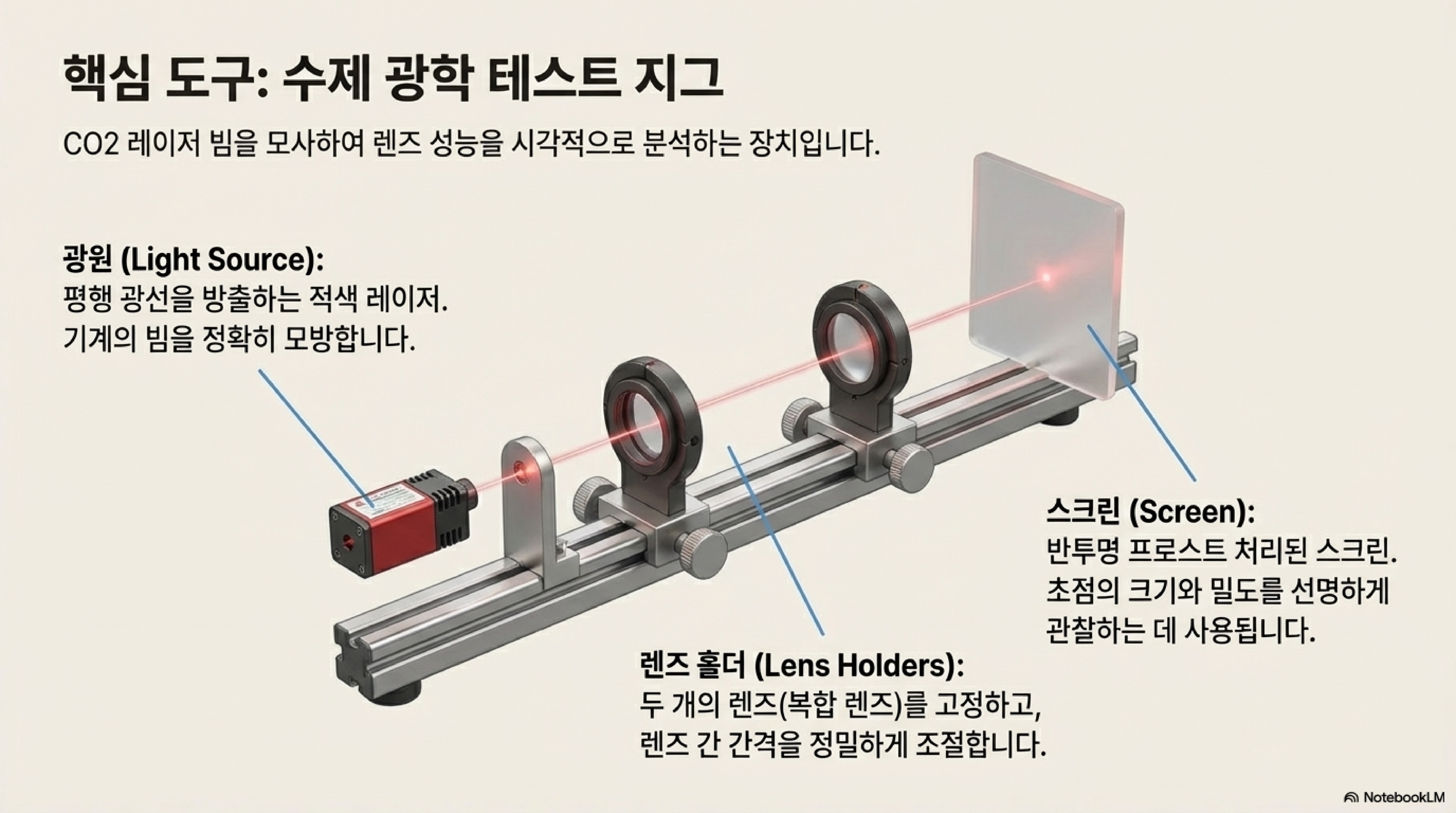 제 테스트 방법론이 가진 명확한 한계점이자 흥미로운 과학적 사실도 발견했습니다. 고출력 레이저에 주로 사용되는 '갈륨 비소(Gallium Arsenide)' 렌즈는 적외선은 훌륭하게 투과시키지만, 가시광선은 전혀 통과시키지 못하는 "완전히 검은색" 물질입니다. 즉, 제 빨간색 가시광선 레이저 테스트 장비로는 이 렌즈의 성능을 전혀 확인할 수 없었습니다. 이 역설적인 상황은 제 시각적 테스트 방법이 모든 종류의 렌즈에 적용될 수 없다는 한계를 명확히 보여주었습니다. 이는 과학적 원리가 어떻게 실제 도구의 적용 범위를 제한하는지 보여주는 좋은 예시였습니다.