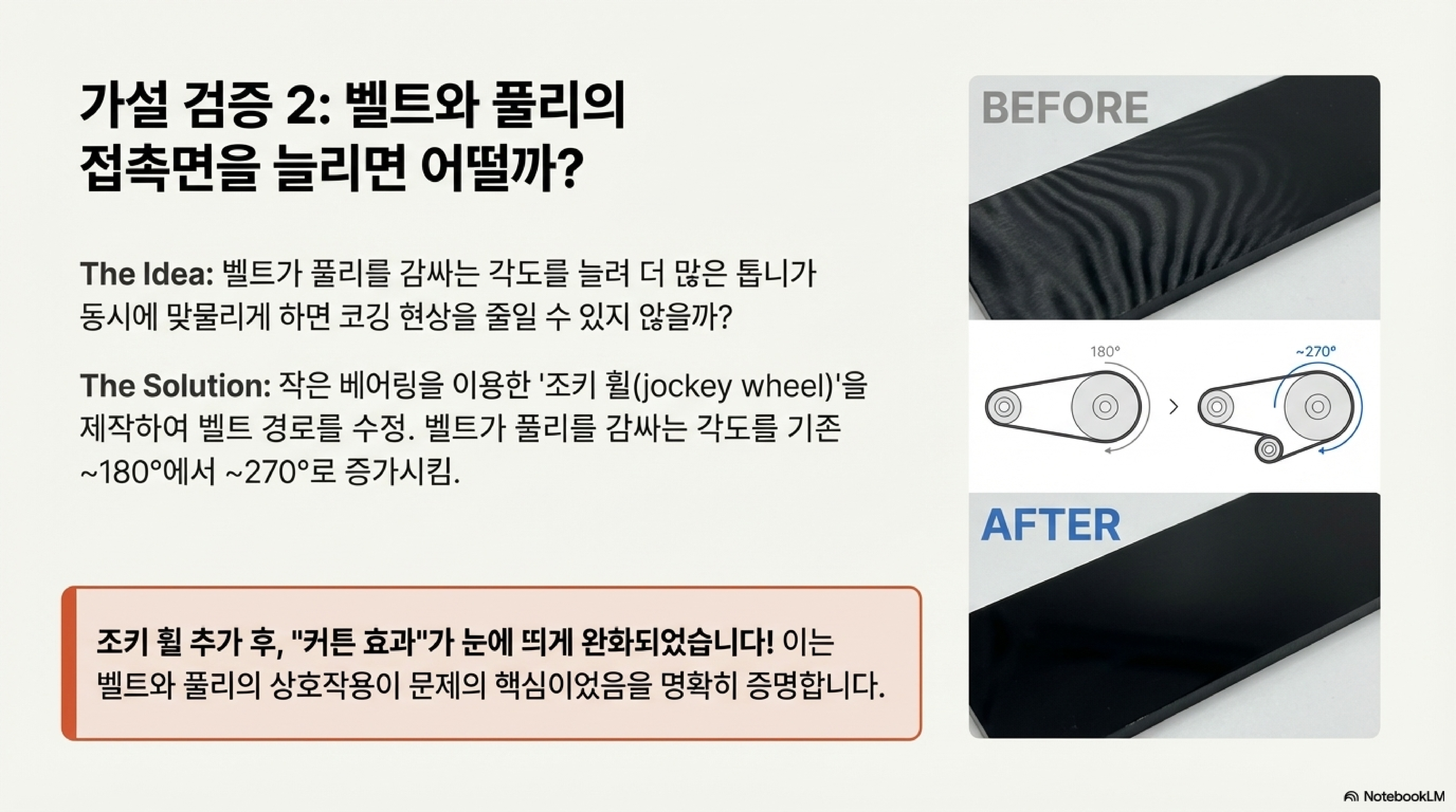 이 분석은 표면적인 문제 너머에 있는 근본적인 기계적 원리를 이해하는 것이 얼마나 중요한지를 보여줍니다. 단순히 '벨트가 문제다'라고 생각하는 대신, '벨트와 풀리의 상호작용 방식'과 '주기적 패턴'이라는 증거를 연결함으로써 문제의 본질에 정확히 접근할 수 있었습니다.