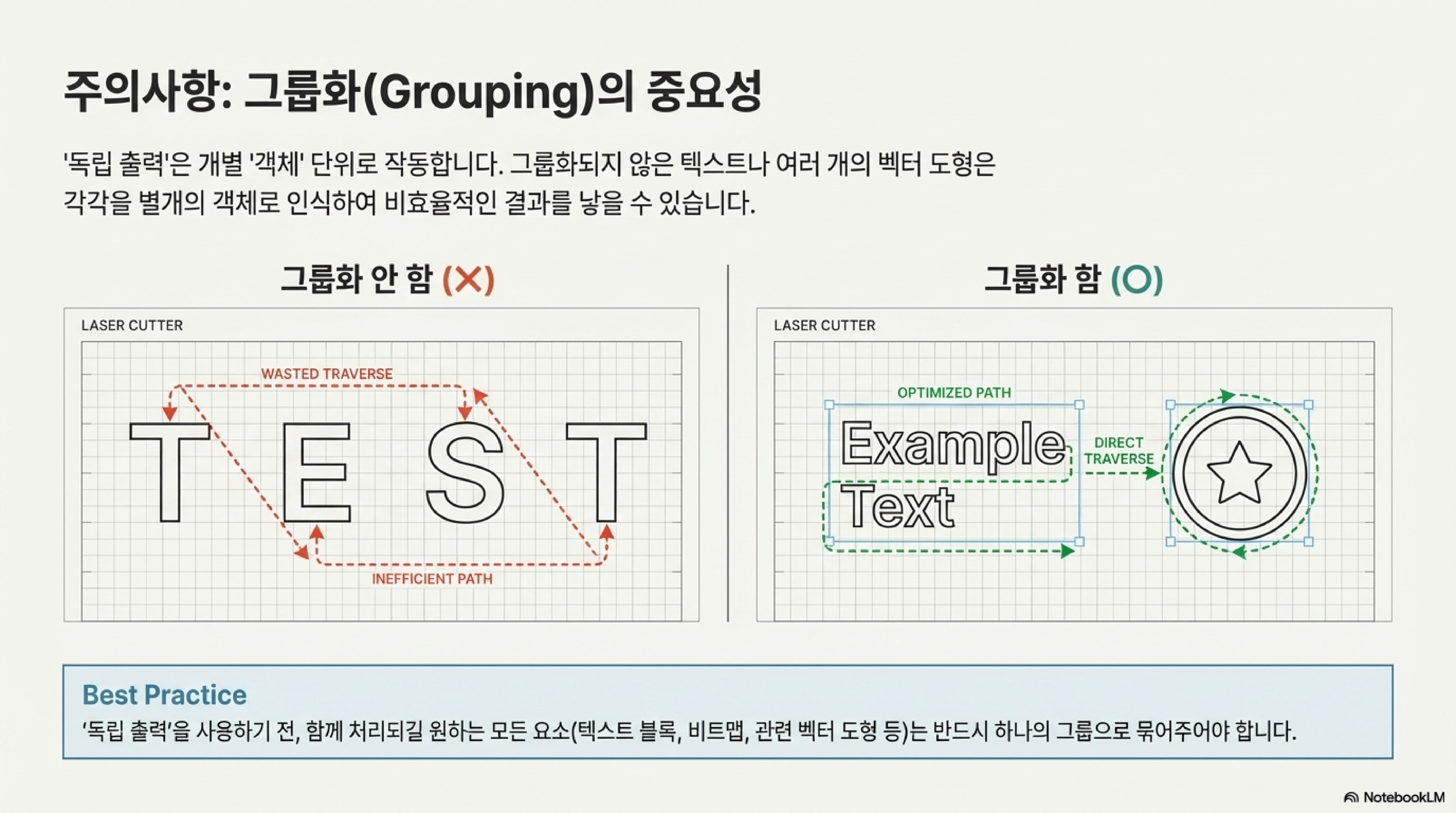 하지만 이 기능에는 치명적인 역설이 숨어있었습니다. 빈 공간을 스캔하지 않아 시간을 절약하도록 설계된 이 기능이, 특정 상황에서는 오히려 작업 시간을 터무니없이 늘릴 수 있다는 점입니다. 텍스트 덩어리에 이 기능을 적용하자, 소프트웨어는 텍스트 전체를 하나의 객체로 인식하는 것이 아니라 '각 글자'를 개별 객체로 인식했습니다. 그 결과, 한 글자씩 따로 스캔하고 가감속을 반복하느라 엄청난 오버헤드가 발생했습니다. 심지어 텍스트를 그룹으로 묶어도 이 문제는 해결되지 않았습니다.