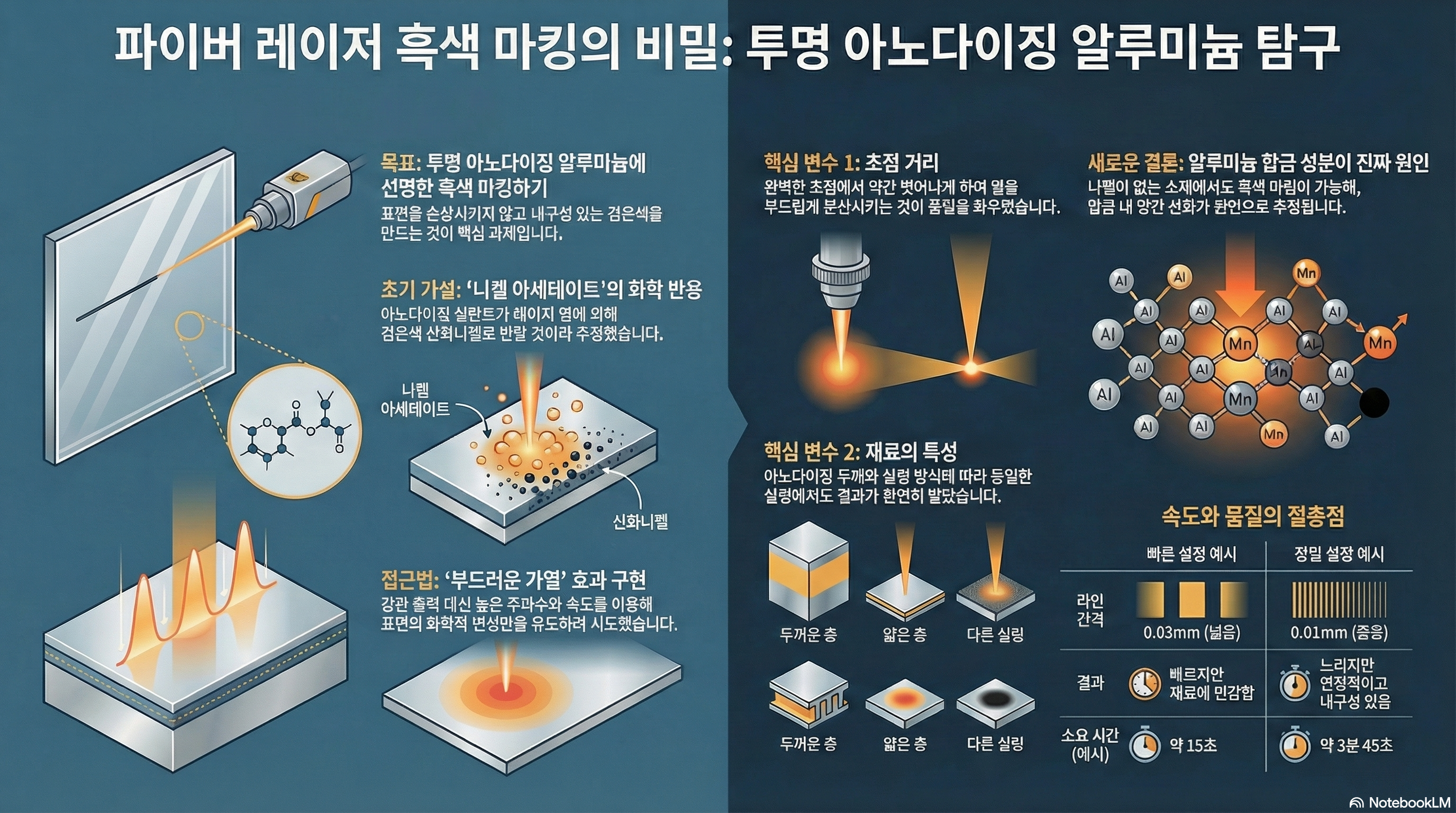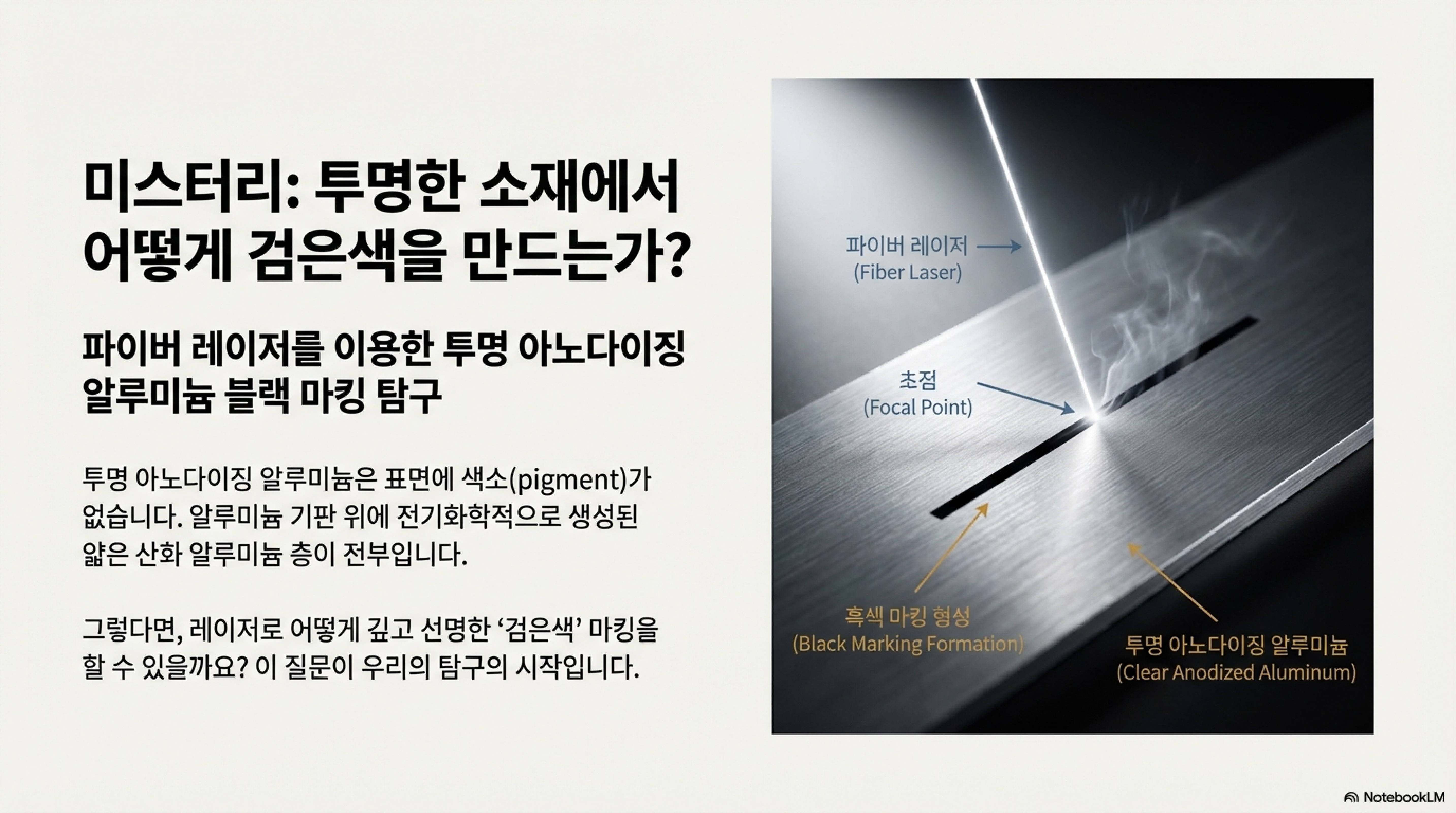 '마킹이 불가능하다'고 여겨지는 재료에 도전하는 것은 모든 기술 애호가의 가슴을 뛰게 합니다. 특히 투명 아노다이징 알루미늄은 그 깨끗한 표면 아래 어떤 비밀도 숨기지 않은 듯 보여, 그 위에 선명한 검은색 마크를 새기는 것은 거의 불가능에 가까운 과제로 느껴집니다. 이 난제를 해결하기 위한 저의 탐사 과정은, 마치 한 편의 추리 소설처럼 예상치 못한 반전과 놀라운 발견으로 가득했습니다. 우리가 굳게 믿었던 과학적 가설이 산산조각 나고, 상식을 뒤엎는 새로운 기술이 모습을 드러내는 이 흥미진진한 발견의 여정에 여러분을 초대합니다.