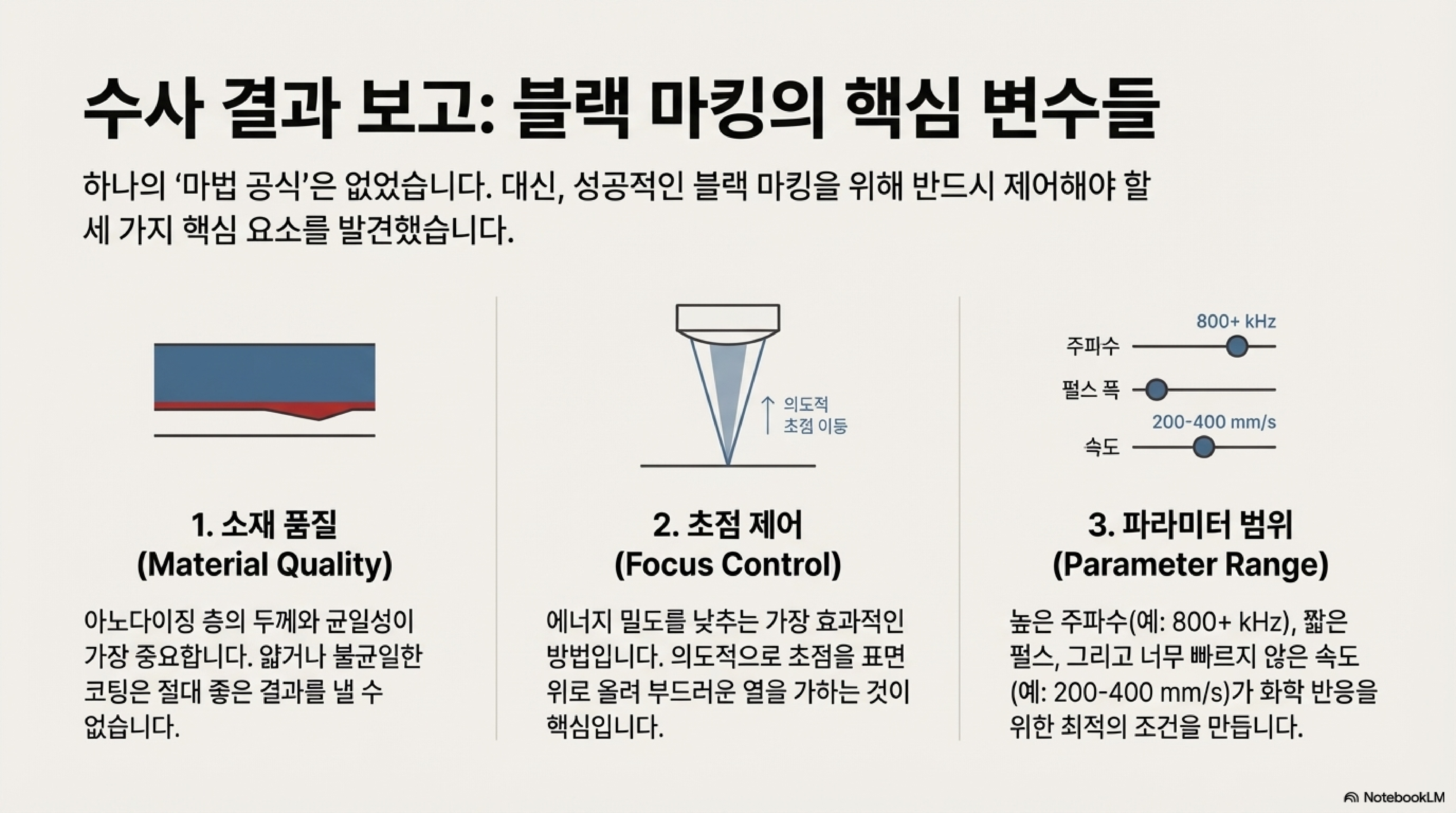 이 실패의 연속은 중요한 깨달음으로 이어졌습니다. 문제는 레이저 설정값이 아니라 '재료' 그 자체에 있었습니다. 아노다이징 층의 두께나 품질이 미세하게라도 다르다면, 결과는 극과 극을 오갔습니다. 완벽한 설정값을 찾는 데 시간을 쏟기 전에, 내가 작업할 재료의 고유한 특성을 먼저 파악하는 것이 가장 중요하다는 것, 이것이 두 번째 발견이었습니다.