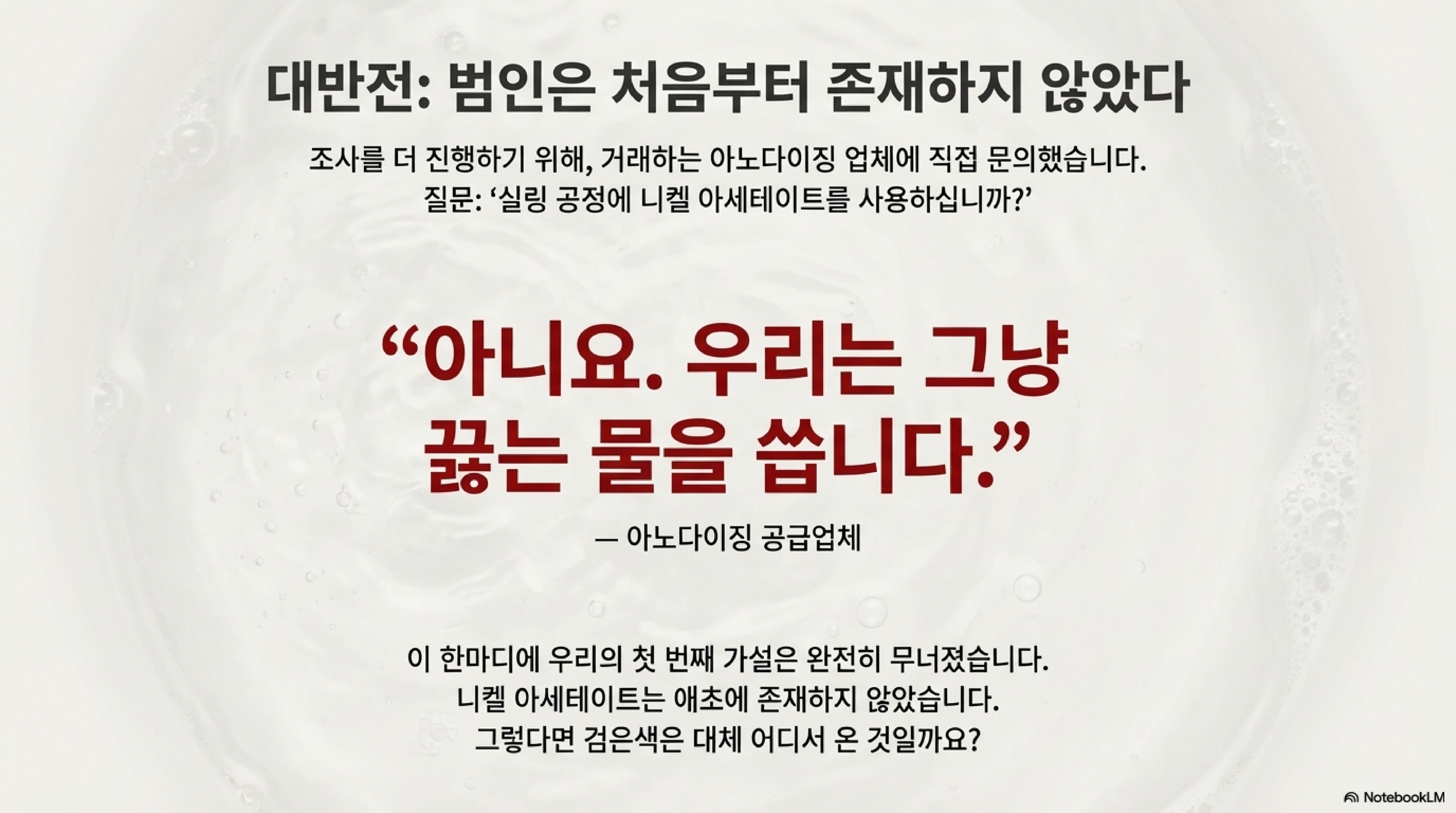 이 한마디는 충격 그 자체였습니다. 검은색 마크의 핵심 원인이라고 믿었던 니켈 아세테이트가 실제로는 제 재료에 전혀 사용되지 않았던 것입니다. 이 발견은 널리 받아들여지는 과학적 설명이 현장의 실제와는 다를 수 있다는 뼈아픈 교훈을 주었습니다. 우리의 전체 가설이 뿌리째 흔들렸고, 이제 원점에서부터 더 깊은 탐사가 필요하다는 것이 명백해졌습니다.