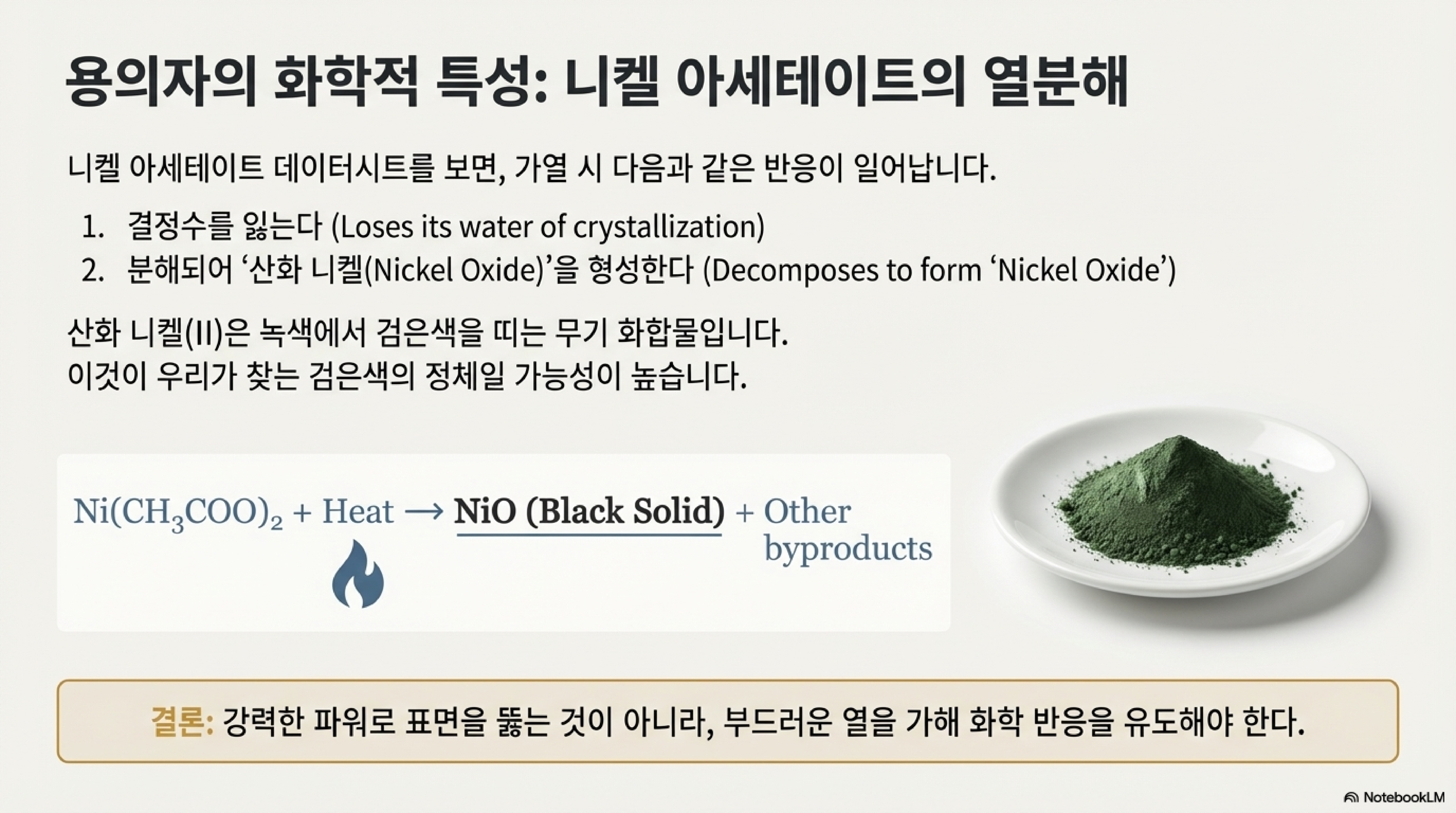 모든 조사는 하나의 그럴듯한 가설에서 시작되었습니다. 투명 아노다이징 알루미늄은 표면의 미세한 구멍을 막기 위해 실링(sealing) 처리를 거치는데, 이때 업계에서 널리 사용되는 화학물질이 바로 '니켈 아세테이트(nickel acetate)'입니다. 저의 초기 가설은 명쾌했습니다. 레이저의 강렬한 열이 이 니켈 아세테이트를 화학적으로 분해시켜 검은색의 산화니켈(nickel oxide)을 생성할 것이라는 논리적인 추론이었죠. 이 가설은 문제의 핵심을 꿰뚫는 듯 보였고, 저는 올바른 길을 가고 있다고 확신했습니다.