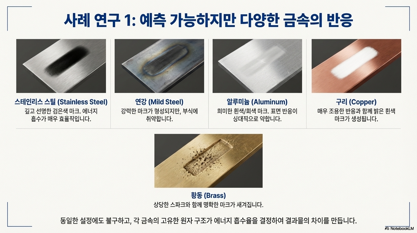 흥미로운 점은 사용하는 금속에 따라 결과가 완전히 달라진다는 것입니다. 황동은 잘 접착되지 않았지만, 구리는 "완벽하고 매우 내구성 있는" 아름다운 자국을 남겼습니다. 가장 놀라웠던 것은 스테인리스 스틸이었는데, "사랑스러운 은색 윤곽"을 가진 "정말 놀라운" 결과를 보여주었습니다. 이는 레이저와 물질의 상호작용이 얼마나 섬세한지를 증명하는 또 다른 사례입니다.