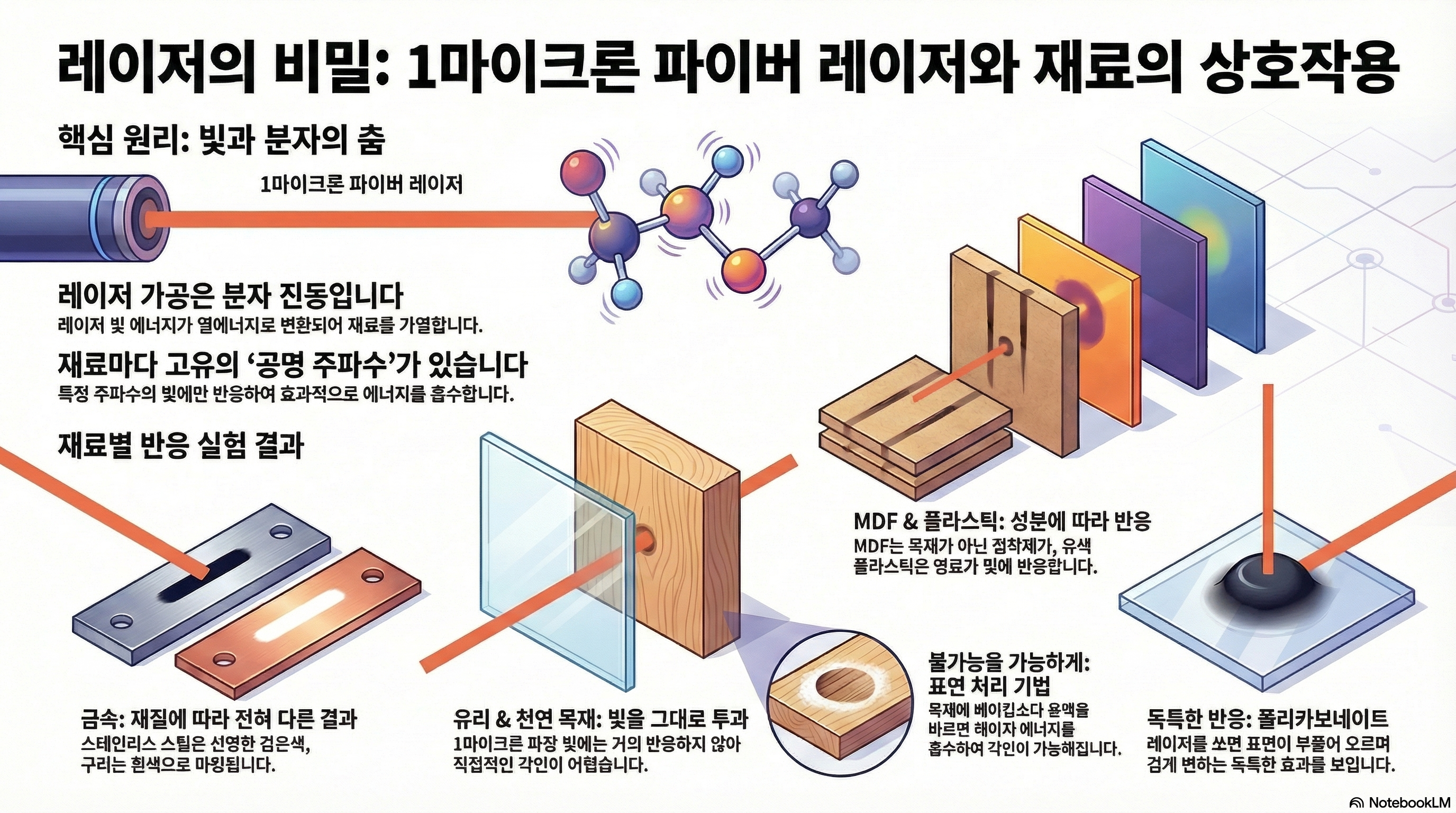 이 실험들은 레이저가 세상과 상호작용하는 방식이 무자비한 힘이 아니라, 빛의 주파수와 물질의 고유한 분자 구조 사이의 정밀한 '대화'에 가깝다는 것을 보여줍니다. 레이저는 단순히 태우는 도구가 아닙니다. 그것은 물질의 고유한 공진 주파수라는 비밀 언어를 이해하고 그에 맞춰 반응하는 정교한 기술입니다.