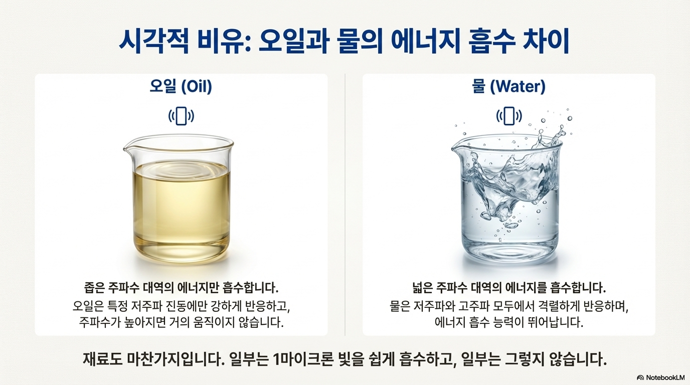 이 원리는 진동하는 유리잔 실험으로 생생하게 이해할 수 있습니다. 먼저 잔에 걸쭉한 식용유를 담고 부드럽게 진동시킨다고 상상해 보세요. 낮은 주파수에서는 기름이 격렬하게 출렁이며 모든 에너지를 흡수합니다. 하지만 주파수를 높이면 기름은 거의 움직이지 않습니다. 이제 기름을 비우고 물을 채워봅시다. 낮은 주파수부터 높은 주파수까지, 물은 계속해서 파동을 일으키며 넓은 스펙트럼의 에너지를 흡수합니다.
