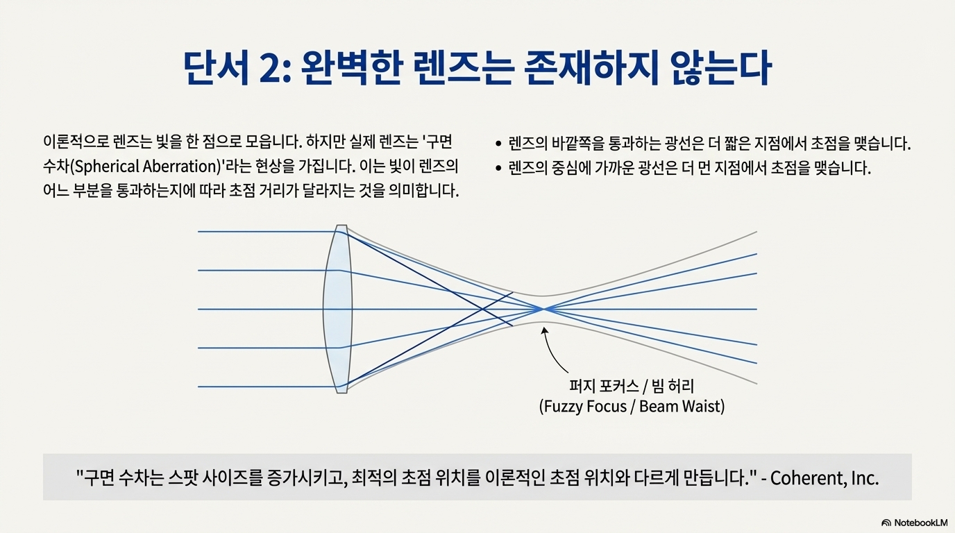 이론은 렌즈가 빛을 완벽한 하나의 점(초점)으로 모은다고 말합니다. 하지만 엔지니어가 마주한 현실은 달랐습니다. 실제 렌즈에는 '구면 수차(spherical aberration)'라는 피할 수 없는 불완전성이 존재합니다. 이로 인해 초점은 칼날 같은 한 점이 아닌, 미세하게 흐려진 '초점 영역(fuzzy focal point)'을 형성합니다.