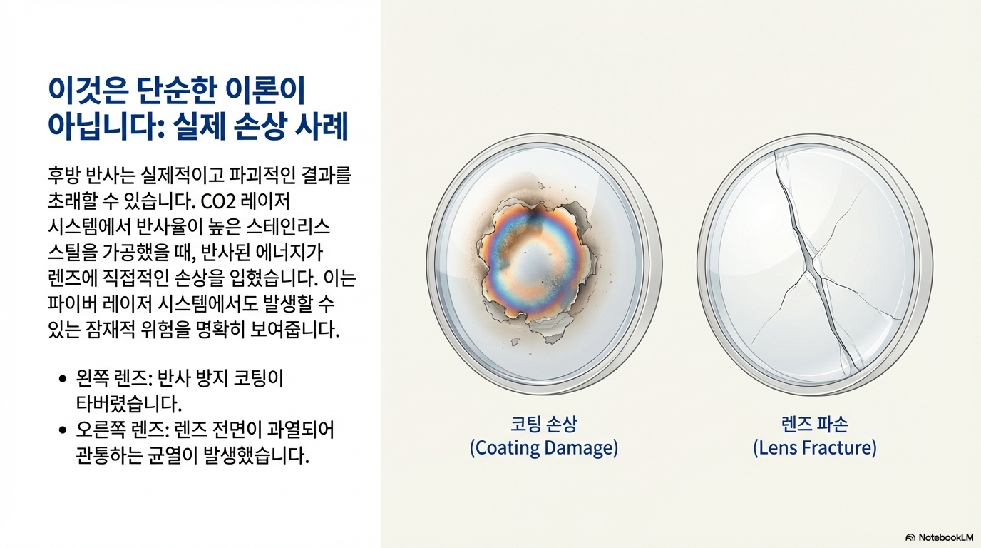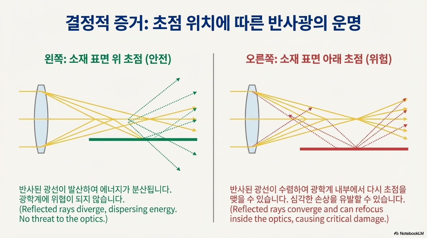 - 초점 아래 (위험): 소재를 초점보다 렌즈에서 멀리 두면, 반사된 빛은 렌즈를 향해 다시 **수렴(converging)**합니다. 마치 돋보기로 햇빛을 모으듯, 반사된 에너지가 다시 파괴적으로 집중되어 광학계로 되돌아가 치명적인 손상을 일으킬 수 있습니다.