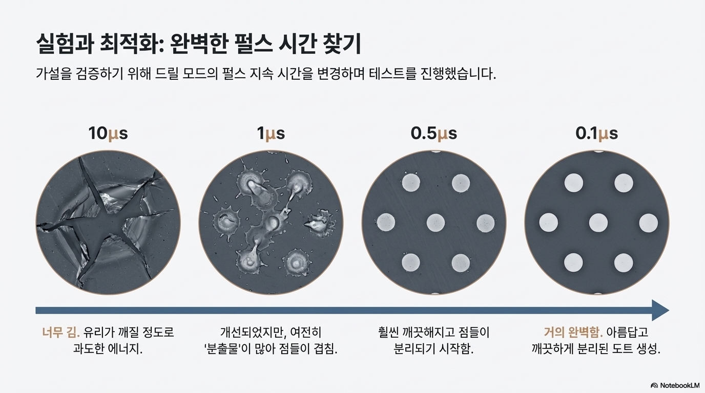 해답은 의외의 곳에 있었습니다. 펄스 길이를 조절하는 대신, '파워를 80%로 낮추는' 방법을 시도했습니다. 놀랍게도 이 방법이 효과가 있었습니다. 에너지가 줄어들면서 가운데가 타버리는 현상 없이, 깨끗하고 선명한 흰 점을 얻을 수 있었습니다.