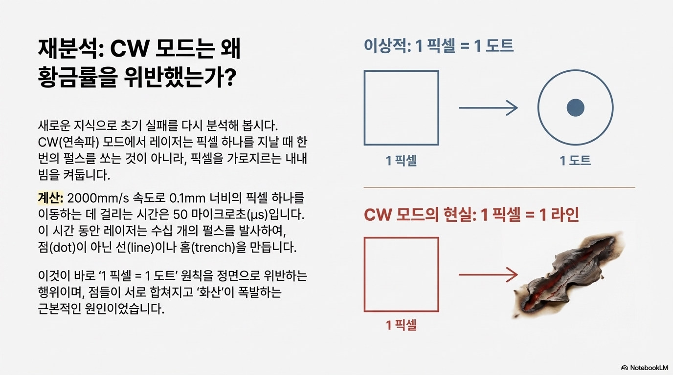 처음에는 단순히 설정값의 문제라고 생각했습니다. 속도, 파워, 주파수 등 수많은 변수를 바꿔가며 테스트했지만 결과는 처참할 정도로 실망스러웠습니다. 여기서부터 모든 것이 잘못되고 있다는 느낌이 들었습니다. 이 실패의 원인은 단순한 설정값의 문제가 아니었습니다. 그것은 재료와 레이저가 상호작용하는 방식에 대한 제 근본적인 오해에서 비롯된 것이었습니다.