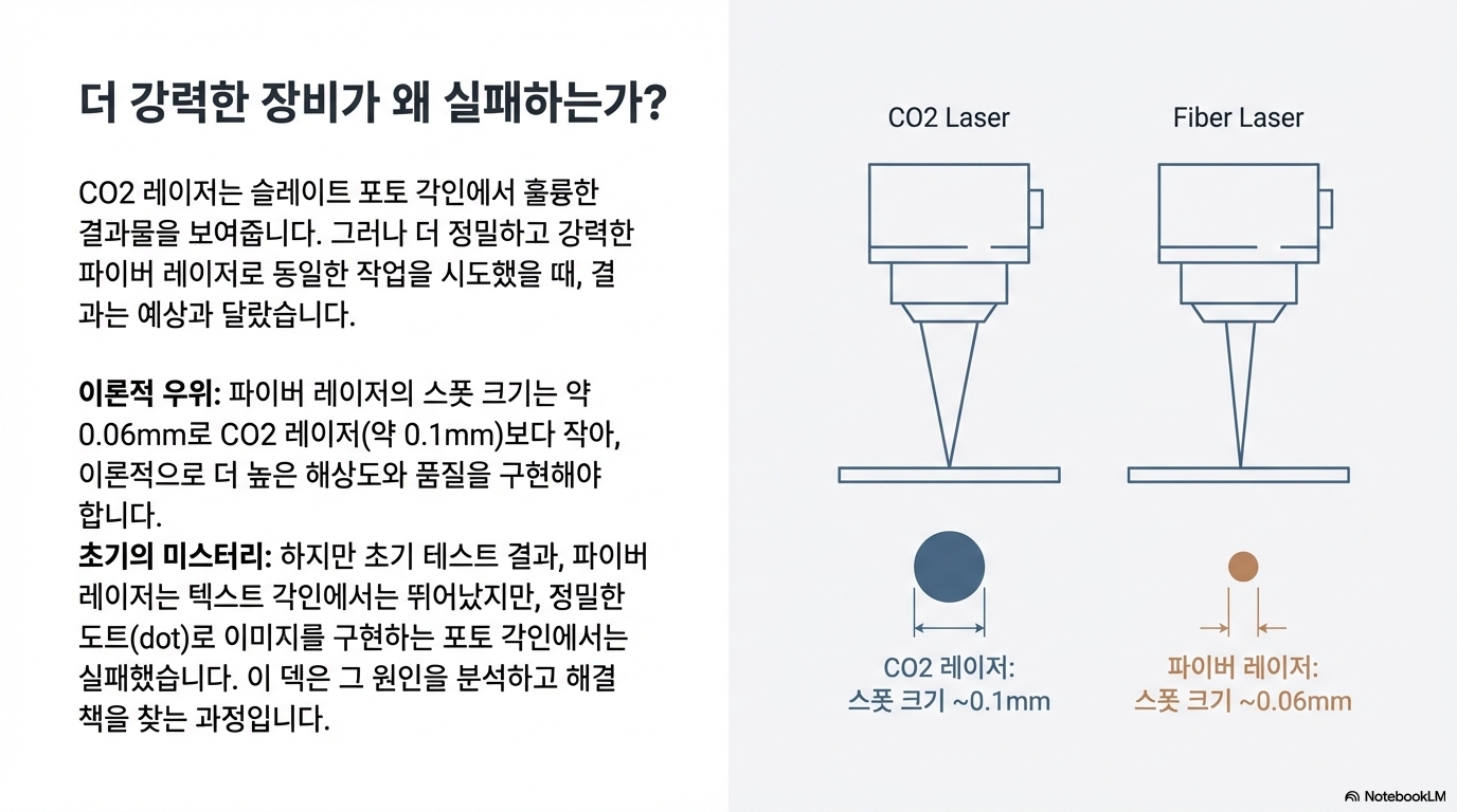 이 글에서는 제가 겪었던 실패의 원인을 파헤치고, 마침내 CO2 레이저를 능가하는 결과를 얻게 된 과정에서 발견한 놀랍고 반직관적인 사실들을 공유하고자 합니다. 당연하게 여겼던 모든 것을 의심하기 시작했을 때, 비로소 길이 보였습니다.