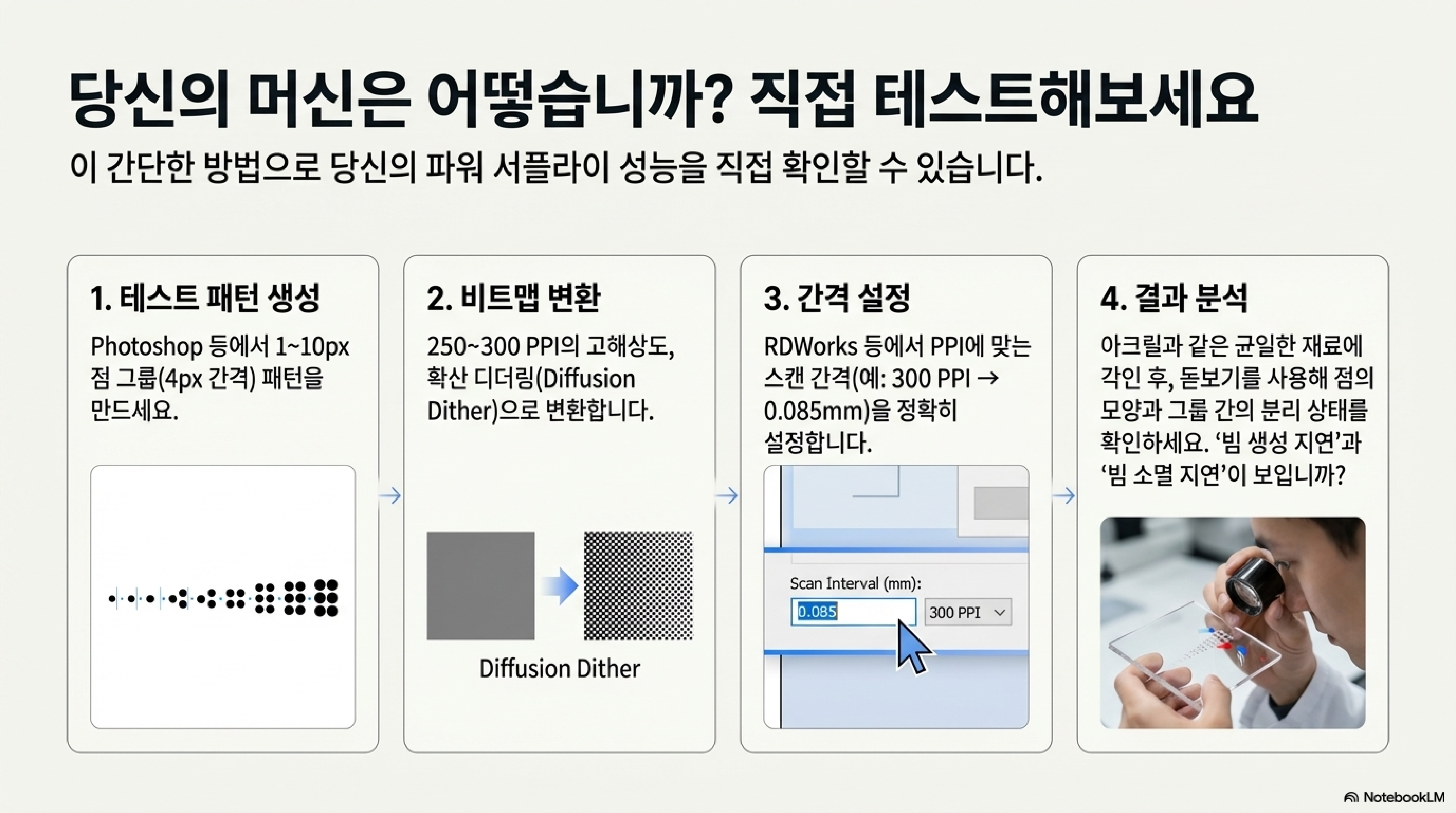 이 놀라운 발견들을 당신의 기계에서도 직접 확인할 수 있습니다. 테스트 방법은 간단합니다. 포토샵 같은 이미지 편집 프로그램에서 순수한 검은색을 사용하여 1, 2, 3, 4 픽셀 너비의 점 그룹들을 만들고, 각 그룹 사이에는 4픽셀의 공백을 두는 방식입니다. 이 파일을 비트맵으로 저장하면 당신만의 진단 키트가 완성됩니다.