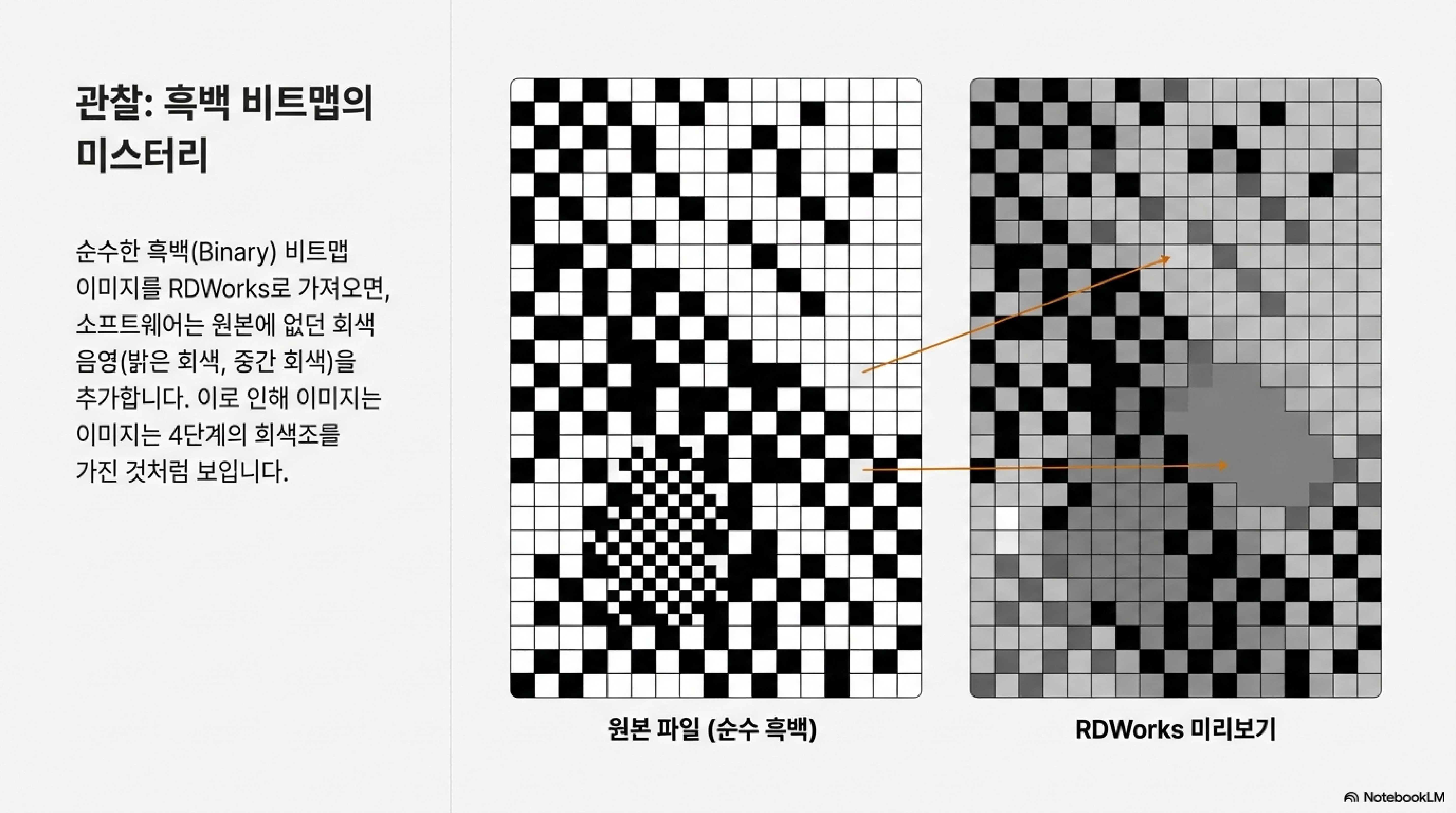 혹시 완벽한 흑백 비트맵 이미지를 RDWorks로 불러왔는데, 소프트웨어가 멋대로 연회색과 중간 회색 음영을 추가하여 4단계 회색조 이미지처럼 보이게 만드는 문제에 의아했던 적 없으신가요? 이것이 첫 번째 발견의 시작점이었습니다. 이 추가된 회색들이 혹시 레이저 출력을 다르게 조절하는 신호는 아닐까 하는 합리적인 의심이 들 수 있습니다.