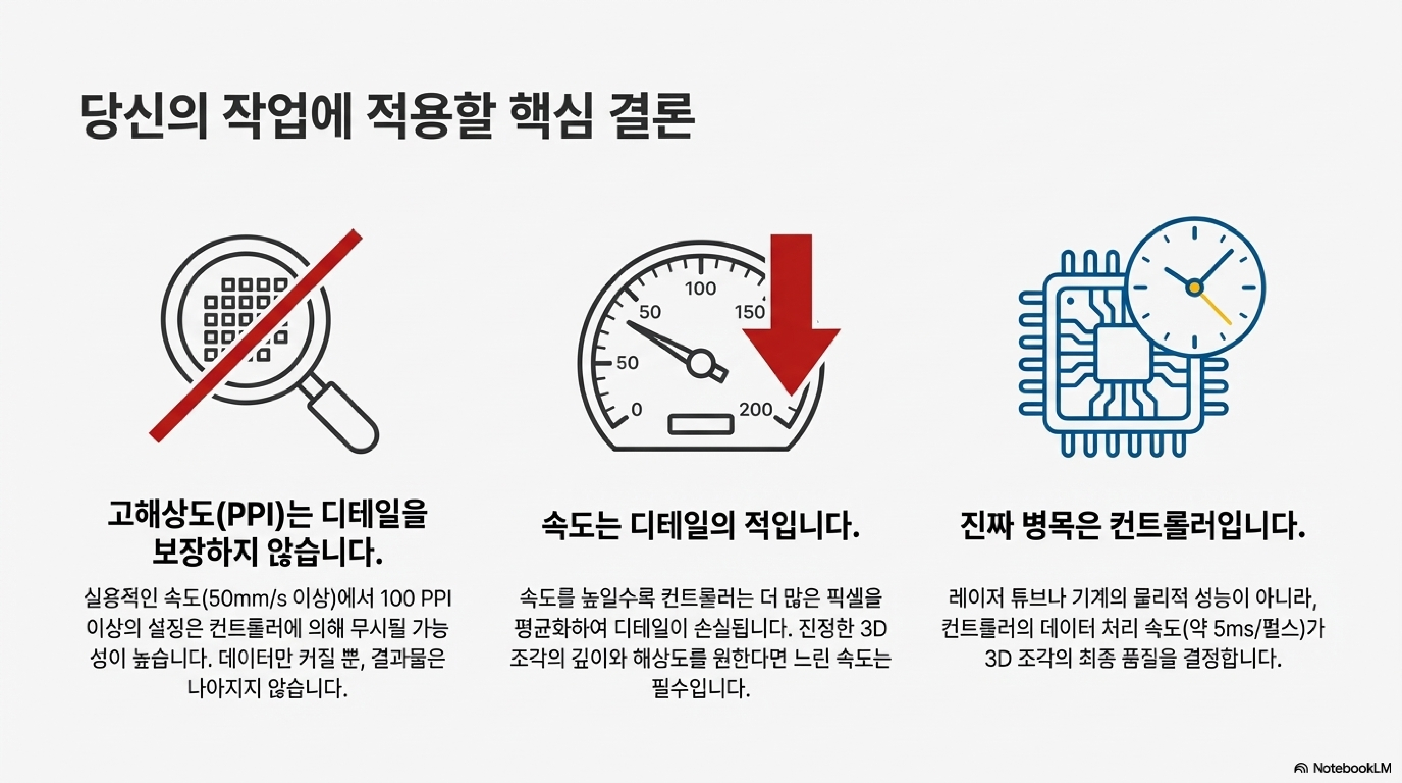 우리가 파헤친 4가지 진실—출력의 비선형성, DPI의 환상, 컨트롤러의 속도 제한, 그리고 기계 부품에 대한 오해—은 하나의 중요한 결론으로 귀결됩니다. 3D 각인의 품질은 우리가 눈으로 보고 만질 수 있는 하드웨어보다, 기계 내부의 보이지 않는 소프트웨어 로직과 숨겨진 규칙에 의해 더 크게 좌우된다는 것입니다.