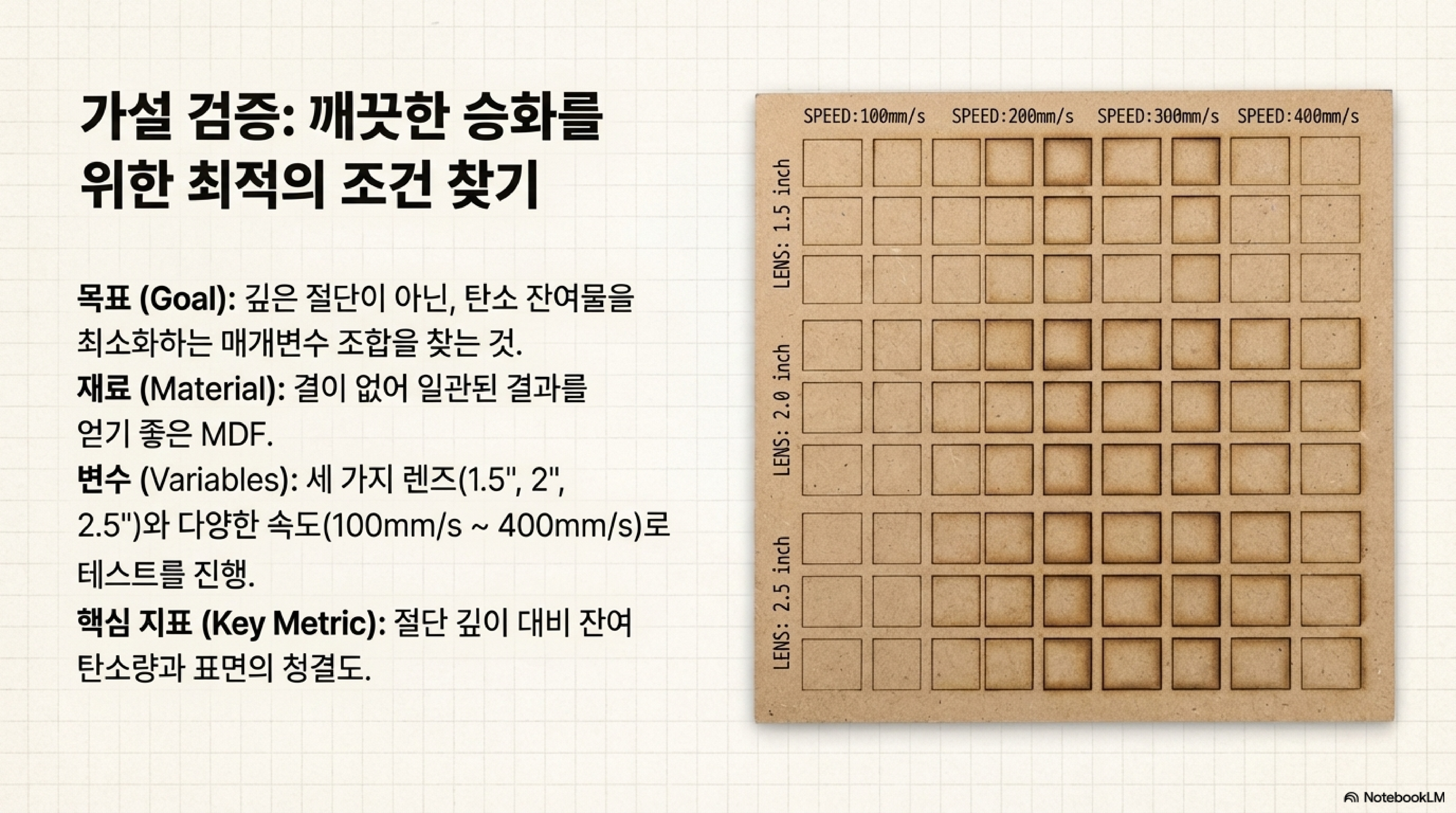 스테인리스 스틸에 특정 화학 물질을 반응시켜 검은 마킹을 남기려면 최소 800°C가 필요했습니다. 알루미늄과 탄소를 결합시켜 알루미늄 카바이드를 만들려면 약 2,000°C의 온도가 필요하다는 사실도 알아냈습니다. 레이저는 이 모든 것을 가능하게 하니, 온도가 최소 2,000°C 이상이라는 것은 분명했습니다. 하지만 결정적인 단서는 아주 뜻밖의 곳, 평범한 나무 각인 작업 중에 숨어 있었습니다.