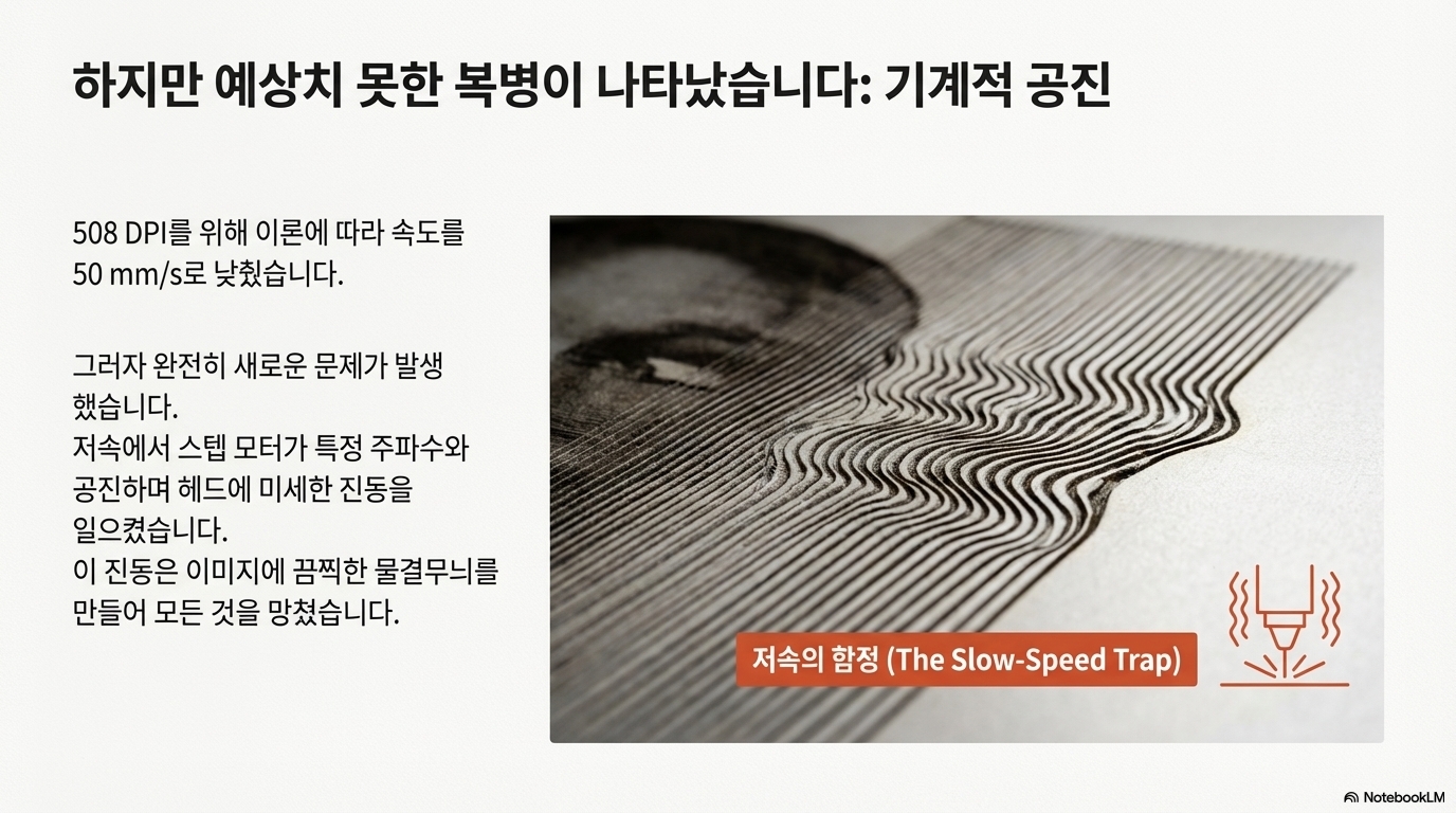 느려진 속도에서 스테퍼 모터는 특정 주파수에서 공진하며 미세한 진동을 만들어냈고, 이 진동은 최종 이미지에 그대로 나타나 물결무늬 같은 원치 않는 자국을 남겼습니다. 이는 실로 역설적인 상황이었습니다. 전자적으로 '올바른' 속도를 선택하자, 기계적으로 '잘못된' 결과가 나타난 것입니다. 그야말로 엎친 데 덮친 격이었습니다.