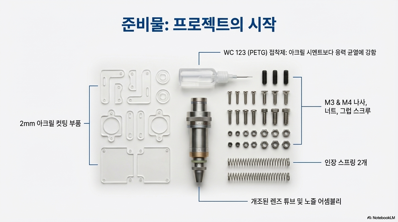 - 수작업 공정 시연: 모든 사람이 나사산을 내는 전문 태핑(tapping) 공구를 가지고 있지는 않습니다. 이를 고려하여 제작자는 특별한 도구 없이 손으로 직접 아크릴에 나사산을 내는 방법을 매우 신중하고 상세하게 보여줍니다. 이는 기술적 장벽을 낮추려는 의도적인 노력입니다.