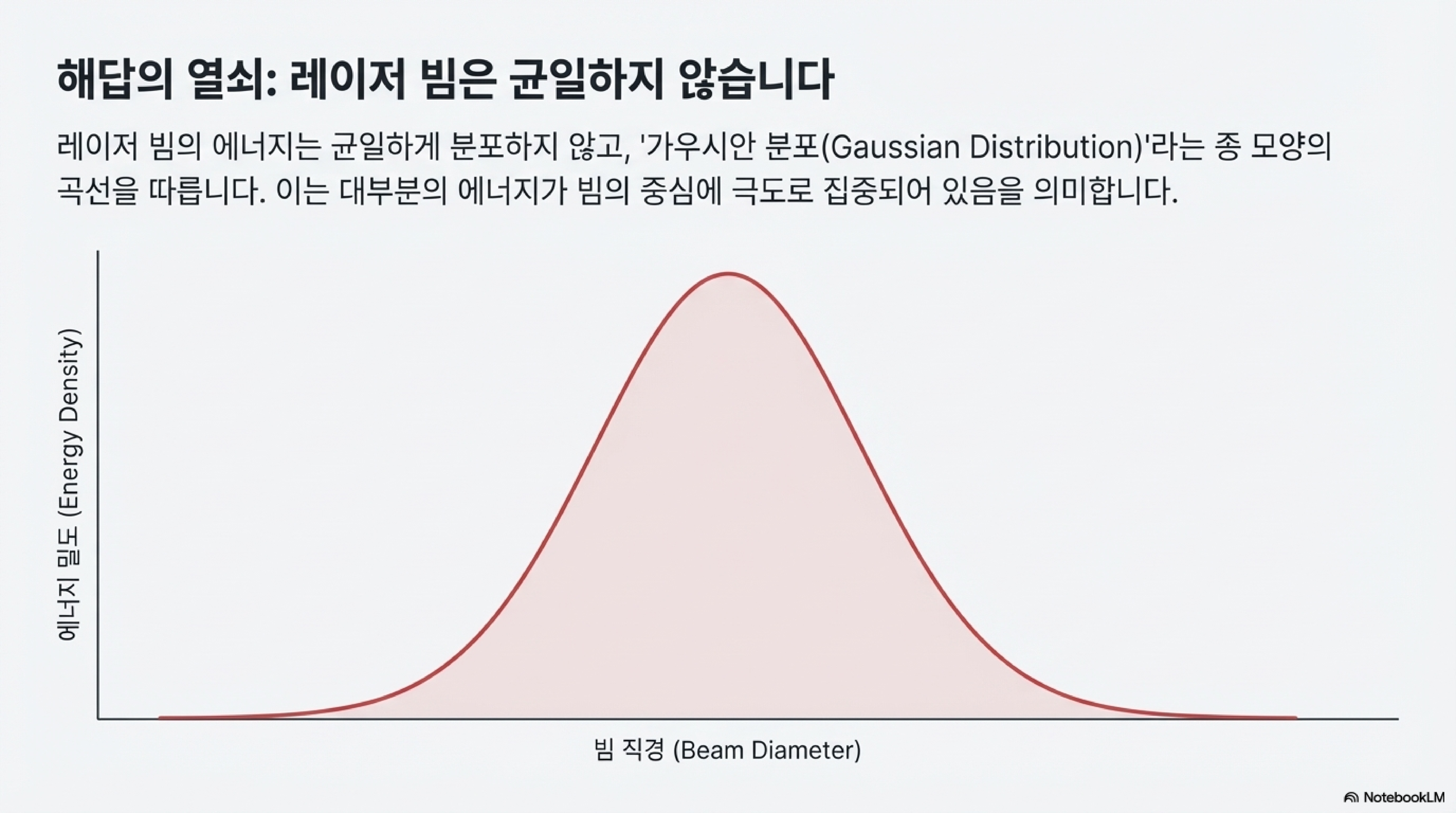 이 현상은 레이저 빔의 출력이 가우시안 분포(Gaussian distribution)를 따르기 때문에 발생합니다. 즉, 빔의 에너지는 전체 너비에 걸쳐 균일하게 퍼져 있는 것이 아니라, 중심부에 압도적으로 집중되어 있습니다. 이는 마치 물을 뿌리는 스프레이와 같습니다. 대부분의 물줄기는 중앙에 강력하게 집중되고, 가장자리로 갈수록 옅은 물안개처럼 흩어지는 것과 같은 원리입니다.