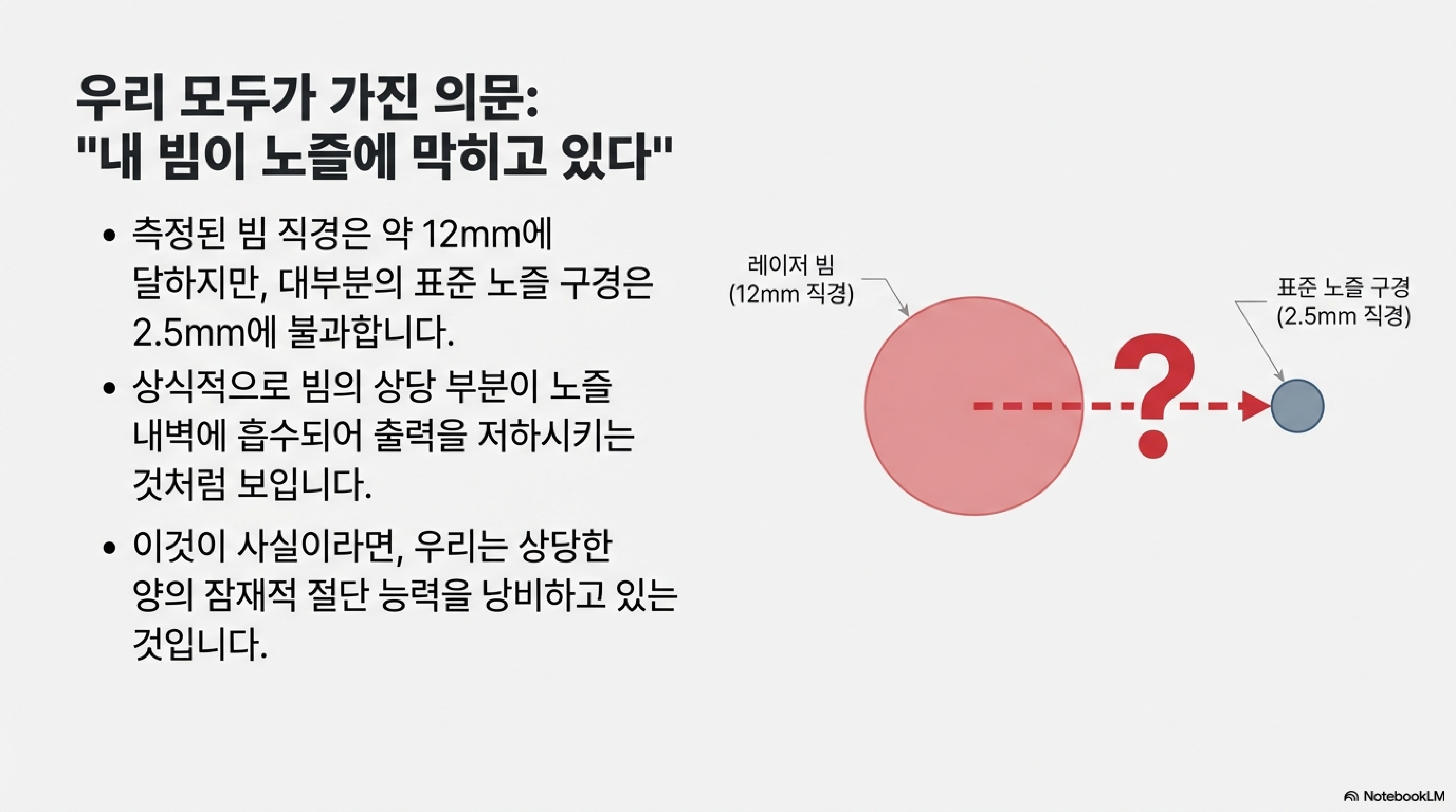 이 실험 결과는 1번 항목에서 살펴본 가우시안 분포 이론을 완벽하게 증명합니다. 표준 2.5mm 노즐은 이미 빔의 유효 출력 96%를 손실 없이 통과시키고 있었던 것입니다. 노즐 구멍을 억지로 넓히는 것은 출력에 아무런 이점을 주지 못할뿐더러, 오히려 깨끗하고 화염 없는 절단에 필수적인 집중된 에어 어시스트의 효율만 떨어뜨리는 결과를 낳습니다.