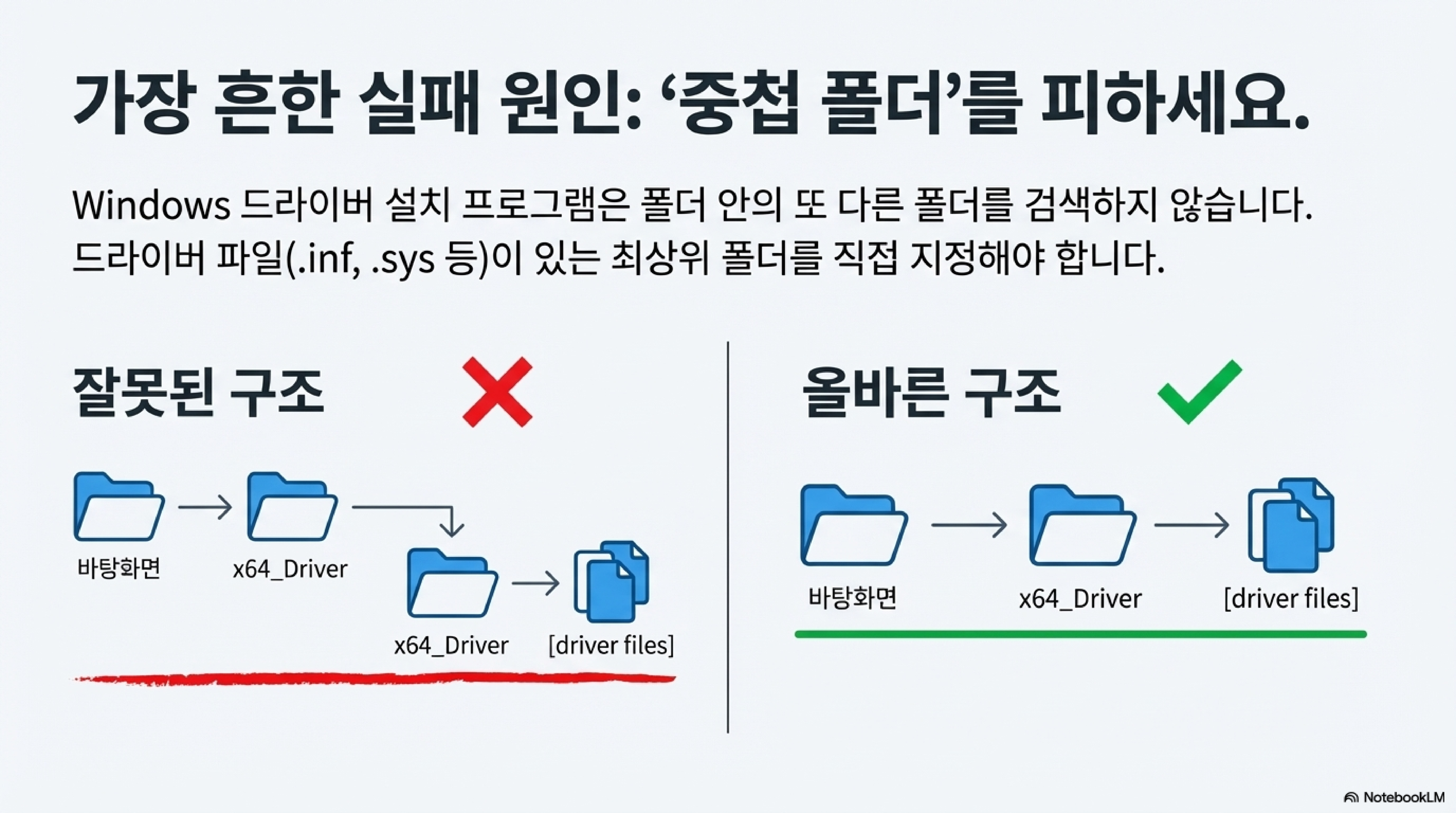 Windows는 사용자가 지정한 폴더의 하위 폴더까지 친절하게 검색해주지 않으며, 압축 파일 내부를 읽을 수도 없습니다. 드라이버 설치 프로그램은 반드시 압축이 풀린 상태여야 하며, .sys, .inf 와 같은 드라이버 파일들이 직접적으로 들어있는 '바로 그' 폴더를 정확히 지정해주어야만 작동합니다. 즉, 폴더를 열었을 때, 그 안에 또 다른 폴더가 아니라 드라이버 파일들이 바로 보여야 합니다.