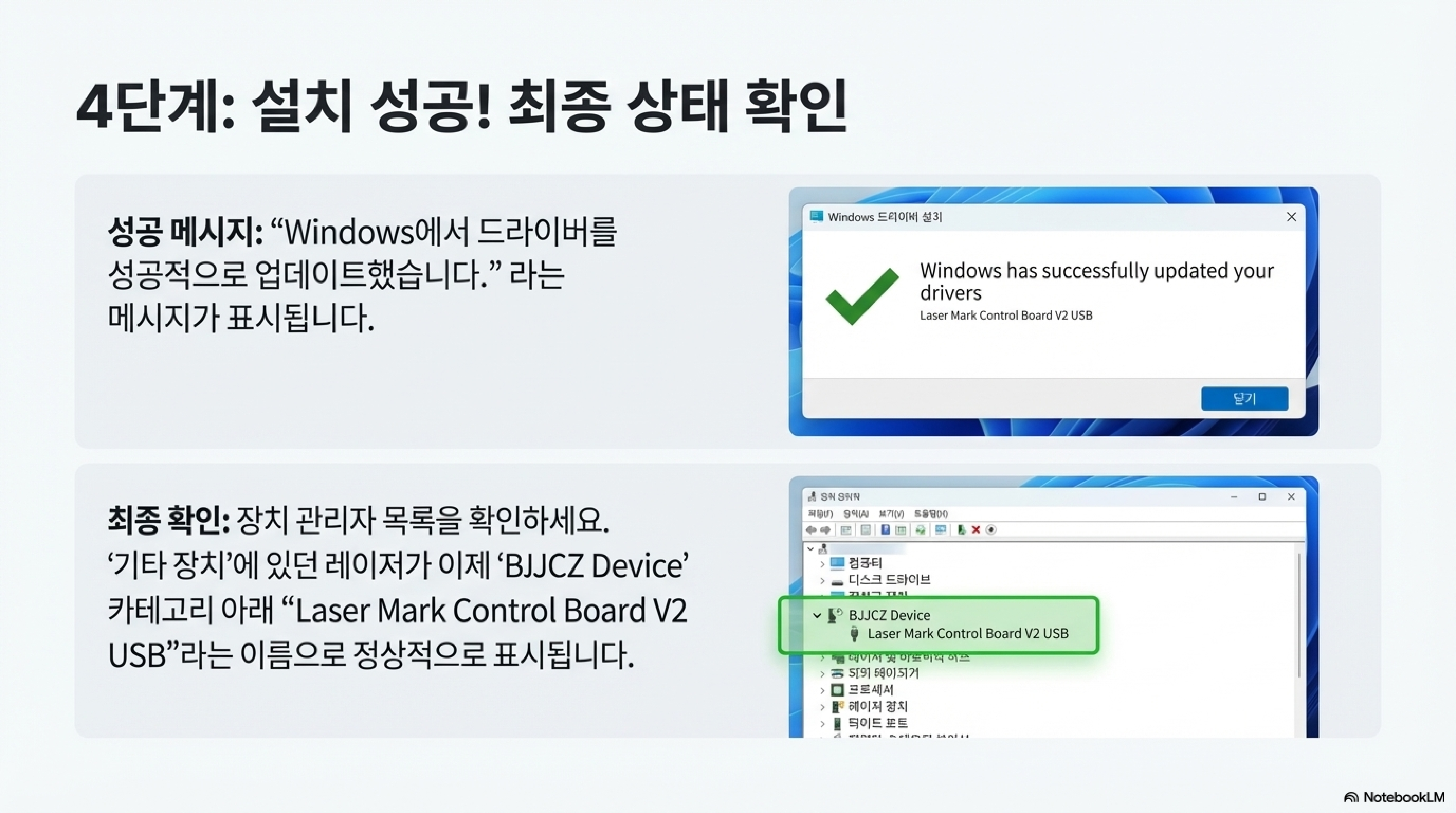 - USB 허브 및 연장 케이블 제거: 드라이버 설치 과정은 매우 민감합니다. 모든 USB 허브와 연장 케이블을 제거하고, 레이저 장비를 PC의 USB 포트에 직접 연결하세요. 이것은 설치 과정의 변수를 최소화하기 위한 임시 조치입니다. 설치가 성공적으로 완료된 후에는, 고품질의 액티브 리피터가 내장된 연장 케이블이나 검증된 USB 허브를 사용할 수 있습니다.