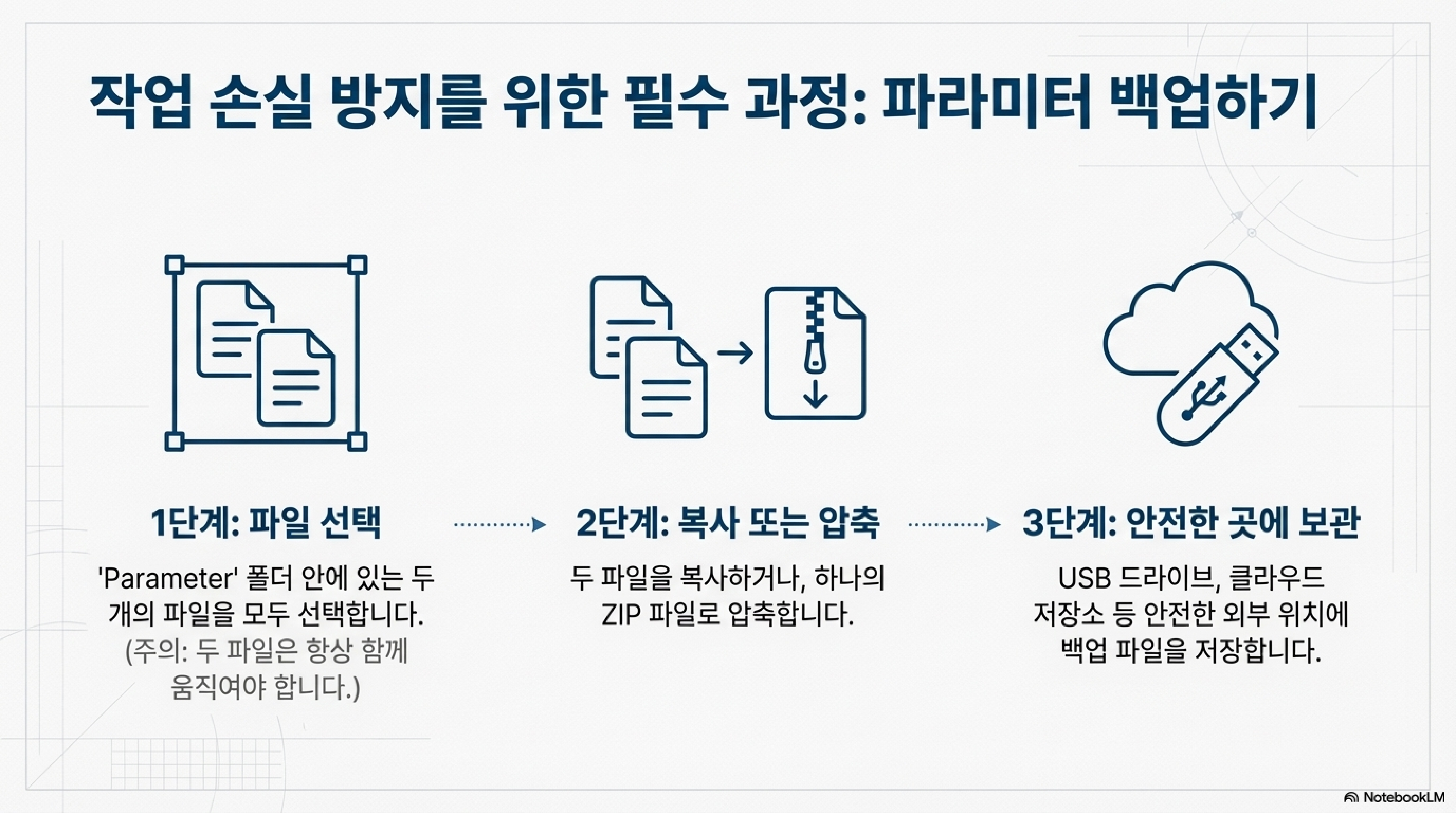 이것이 왜 중요할까요? 갑작스러운 컴퓨터 고장이나 소프트웨어 오류가 발생하더라도 더 이상 당황할 필요가 없습니다. 백업해 둔 파라미터 파일들을 원래 위치에 복사해 넣기만 하면, 단 몇 초 만에 여러분이 수개월, 수년에 걸쳐 쌓아온 모든 작업 데이터를 완벽하게 복원할 수 있습니다. 데이터 백업은 선택이 아닌 필수입니다.