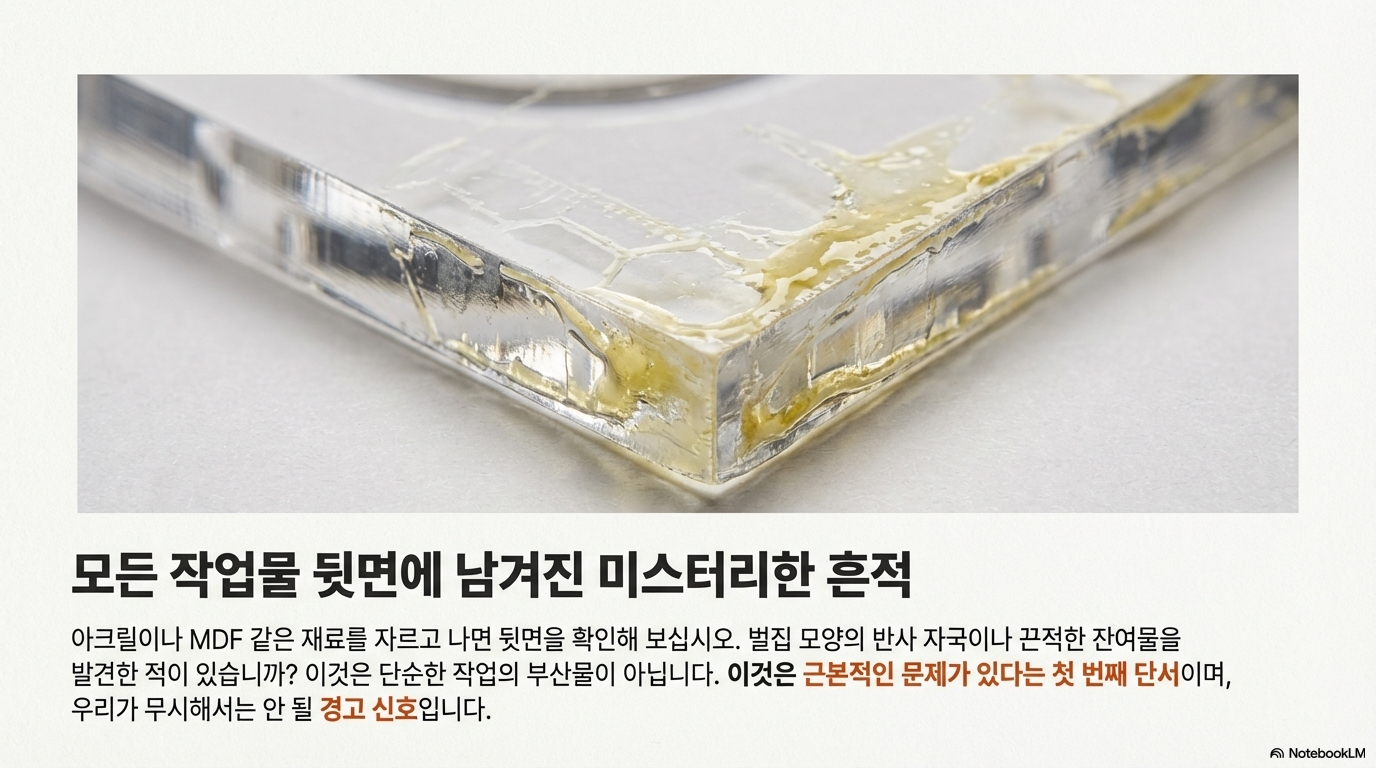 둘째는 응축물 부착입니다. 아크릴이나 목재가 기화되면서 발생한 가스는 제대로 배출되지 못하고, 차가운 벌집 표면과 작업물 뒷면에 다시 응결되어 끈적하고 역겨운 잔여물로 남습니다. 이 잔여물은 작업물을 더럽히고 추가적인 후처리 작업을 요구하게 만듭니다.