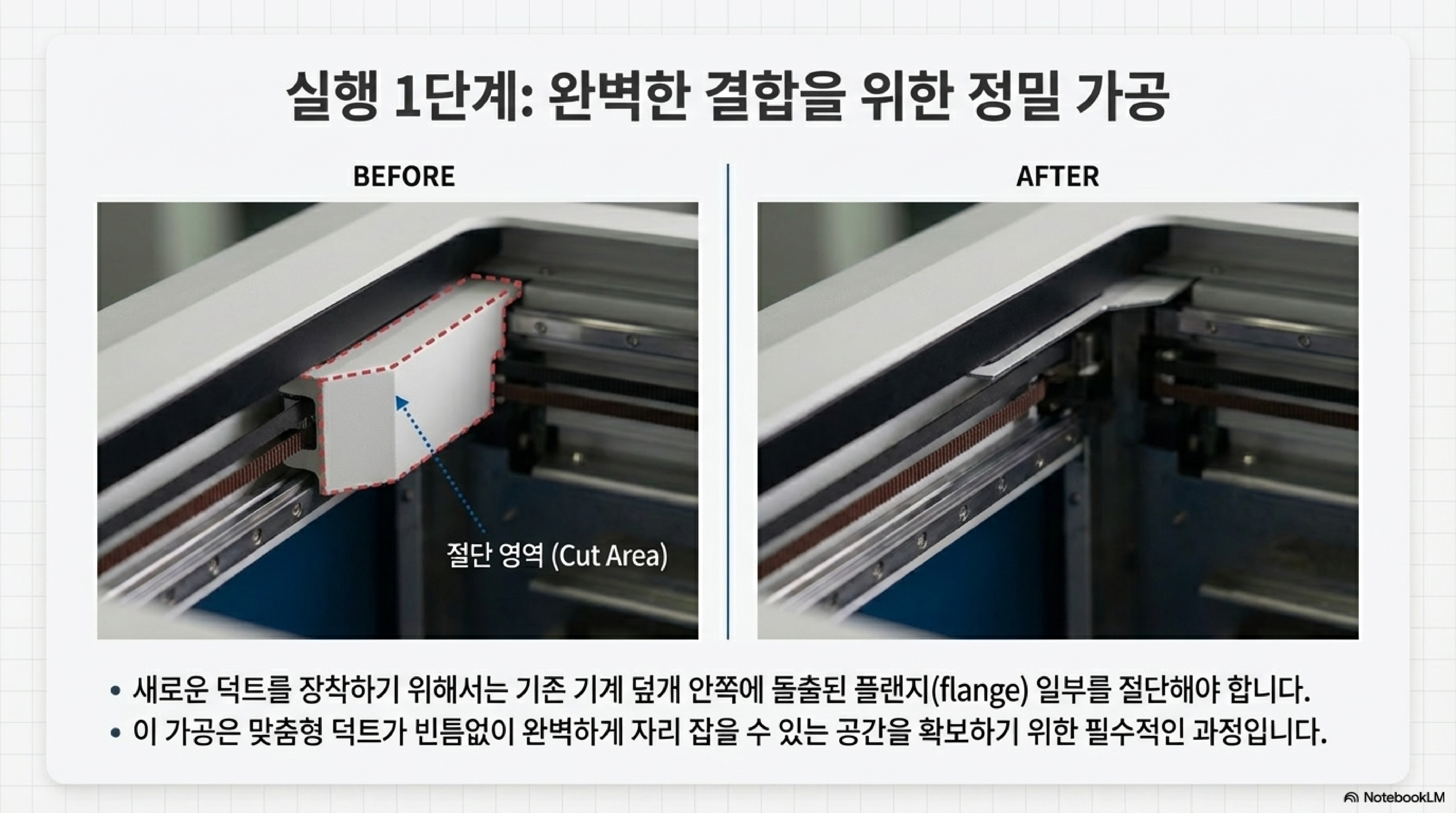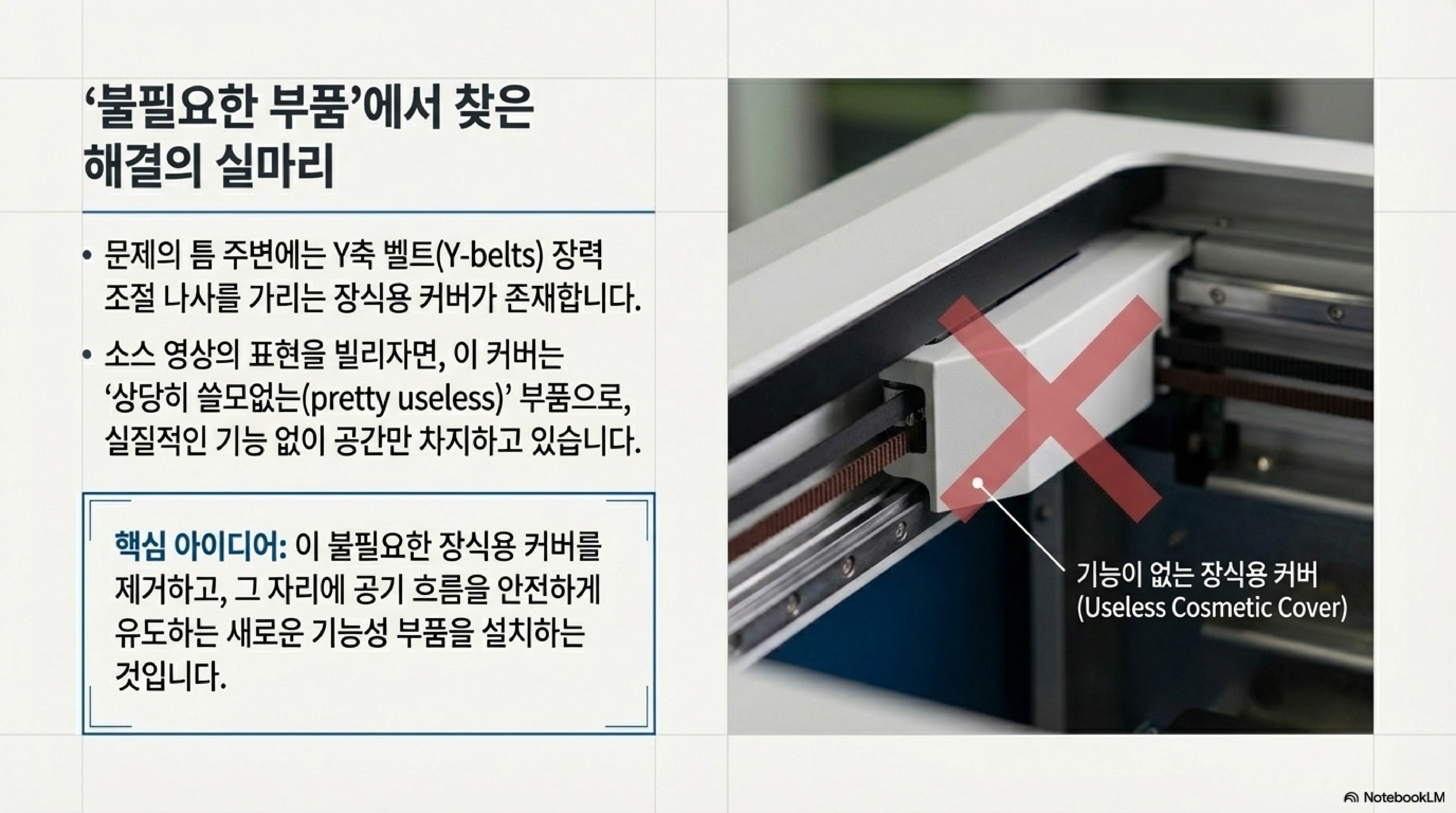 문제 해결의 '아하!' 순간은 이 부품을 재평가하는 데서 나왔습니다. 제작자는 이 쓸모없어 보이는 커버가 차지하고 있는 공간이야말로, 덮개를 닫은 상태에서 공기를 유입시킬 맞춤형 덕트를 설치할 수 있는 완벽한 위치임을 깨달았습니다. 진정한 혁신이란 이처럼 시스템의 모든 요소를 다시 보고, 다른 이들이 단순한 덮개로 여기는 곳에서 잠재력을 발견하는 데서 비롯됩니다.