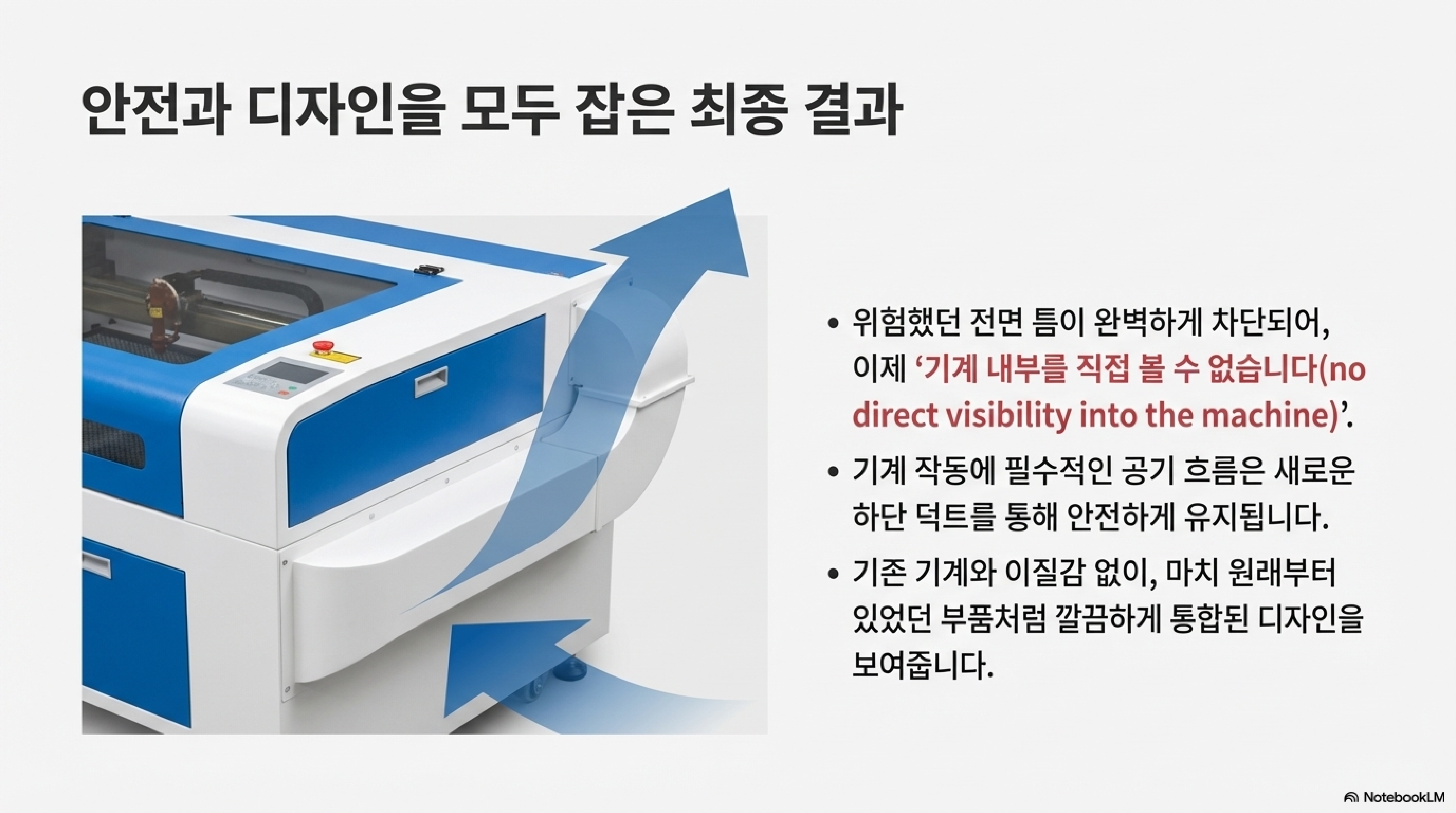 이 기계의 근본적인 문제는 설계 자체에 있었습니다. 원활한 공기 흐름을 확보하기 위해 기계 덮개를 반드시 열어두어야만 했던 것입니다. 이는 사용자를 잠재적인 위험으로부터 보호하기 위해 덮개를 닫고 작동해야 한다는 기계 안전의 기본 원칙과 정면으로 충돌하는 문제입니다.
